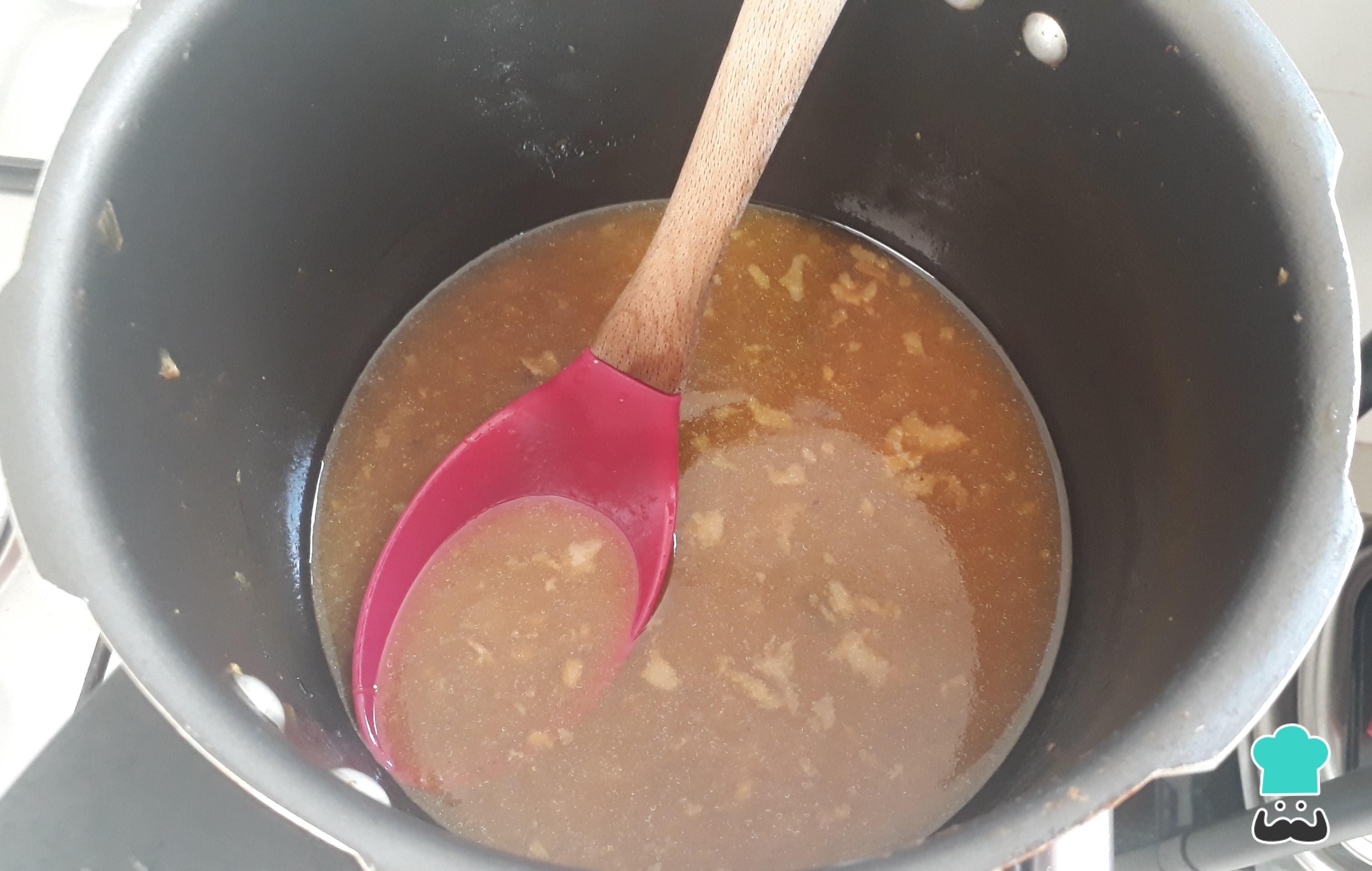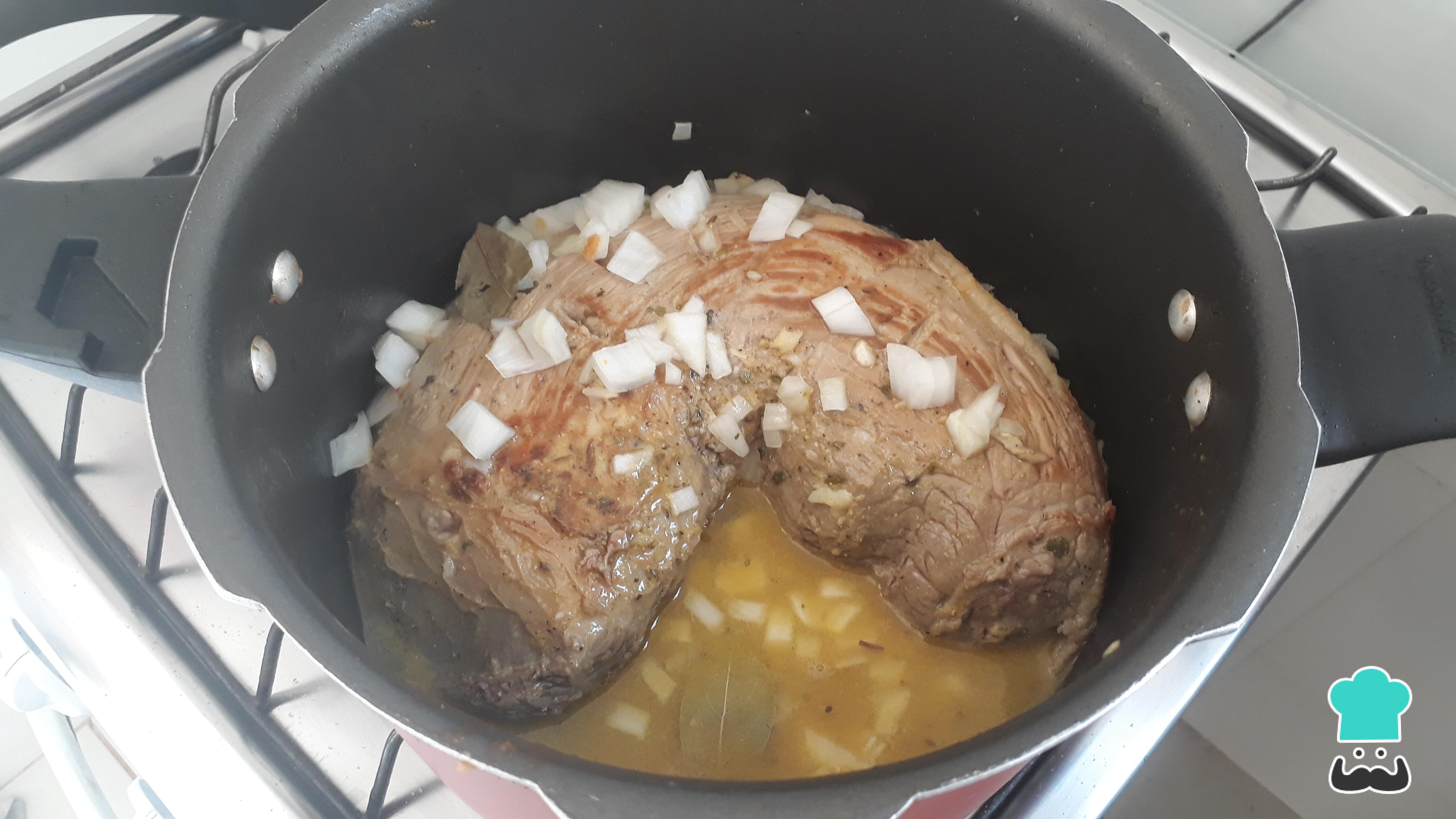 Após selar a carne, acrescente a cebola e os dois copos de água. Misture bem, tampe a panela e conte 50 minutos após pegar a pressão.