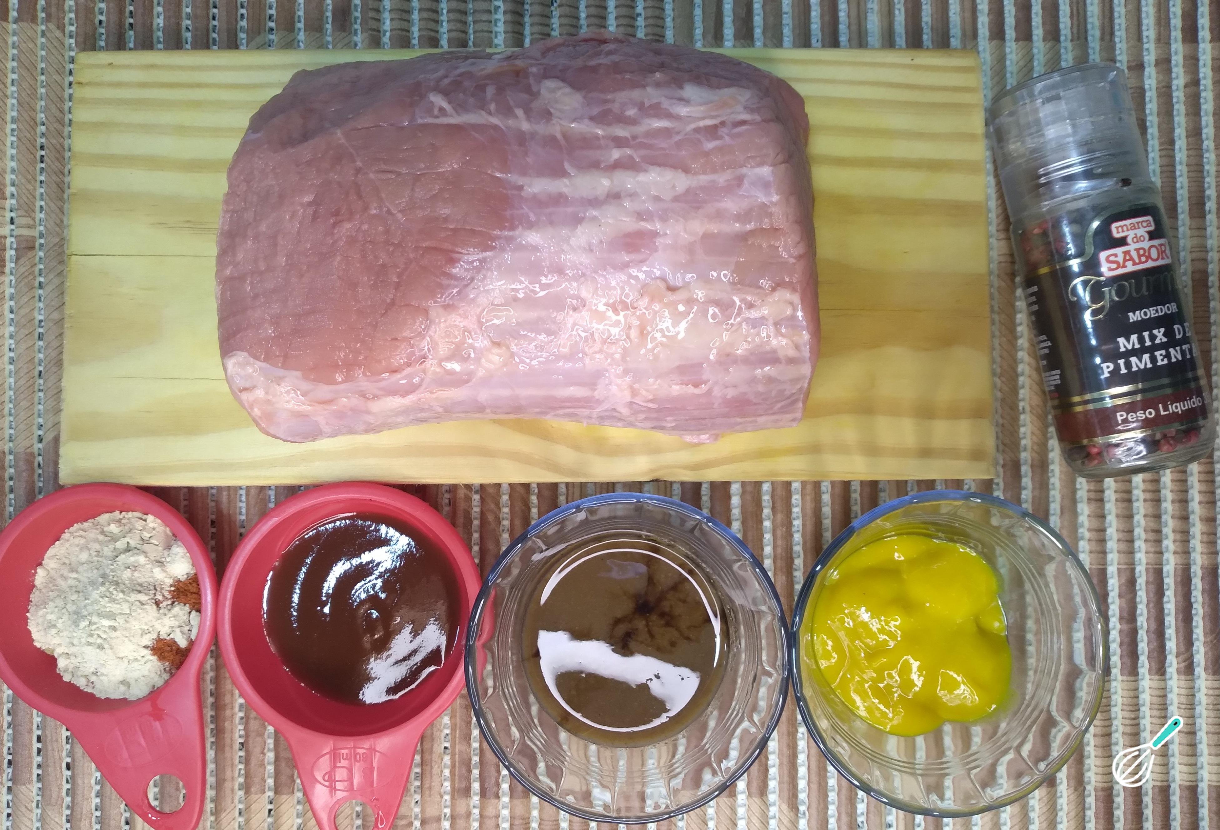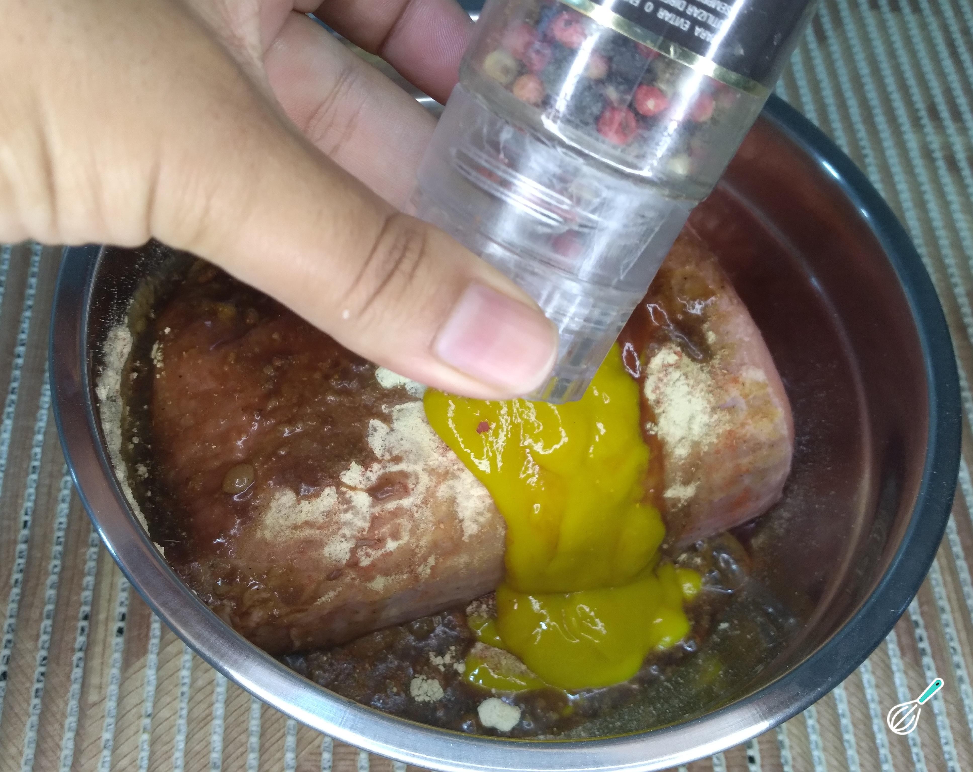 Depois de separar os ingredientes, tempere a carne. Com um faca, faça cortes sobre a carne. Em seguida, adicione o sal, os temperos de sua preferência, a mostarda, o molho barbecue, o molho inglês e o molho para carne. Coloque pimenta e reserve o vinagre. Passe bem os temperos na carne e depois, coloque a carne na geladeira por 1 hora.