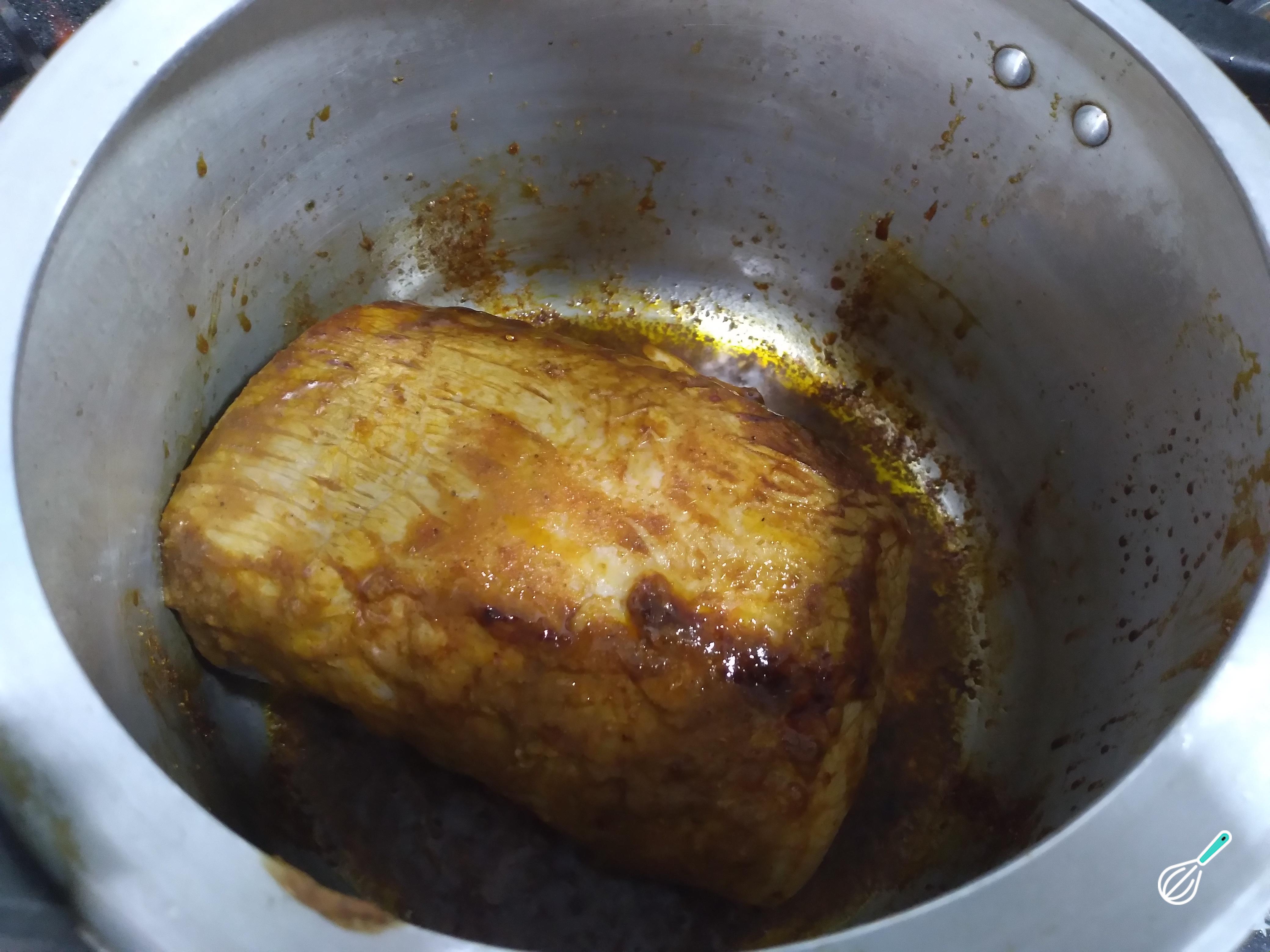 Retire a carne da geladeira depois do tempo de marinada. Em uma panela de pressão, coloque o óleo de soja e o açúcar mascavo. Coloque a carne e deixe dourar de um lado. Em seguida doure de outro. Acrescente o vinagre e coloque água. Não é necessário cobrir a carne com água. Tampe a panela e assim que pegar pressão, deixe cozinhar por 50 minutos. Depois desse tempo, desligue o fogo e deixe a pressão sair. Cozinhe em fogo médio.