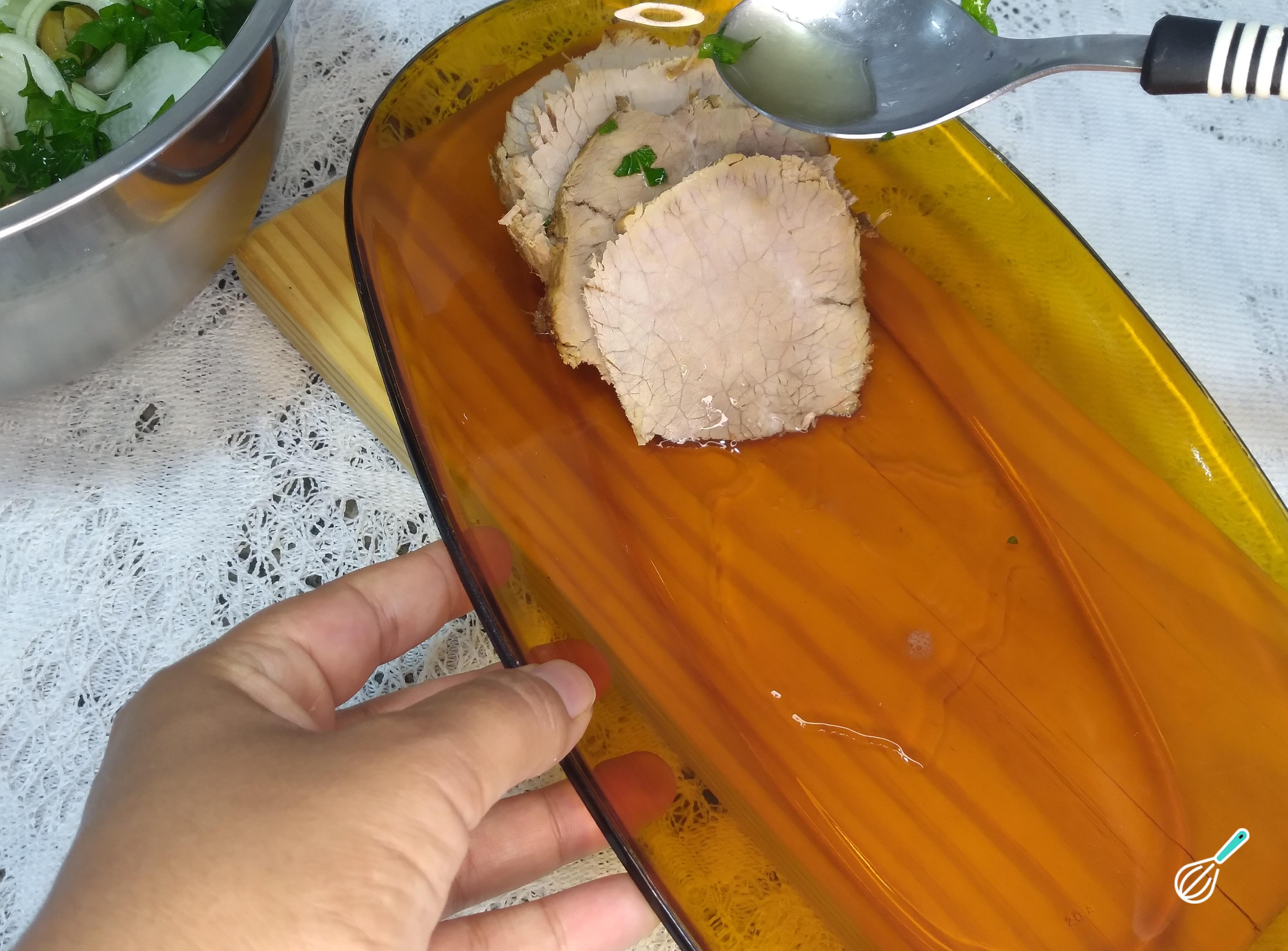 Dica: Para que o lagarto gelado fique bem saboroso, regue bem a carne com o molho.