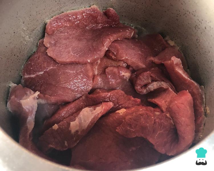 Fatie o lagarto em fatias finas e tempere com sal e pimenta do reino. Em uma panela de pressão aqueça um pouco de azeite de oliva e coloque os bifes de lagarto.