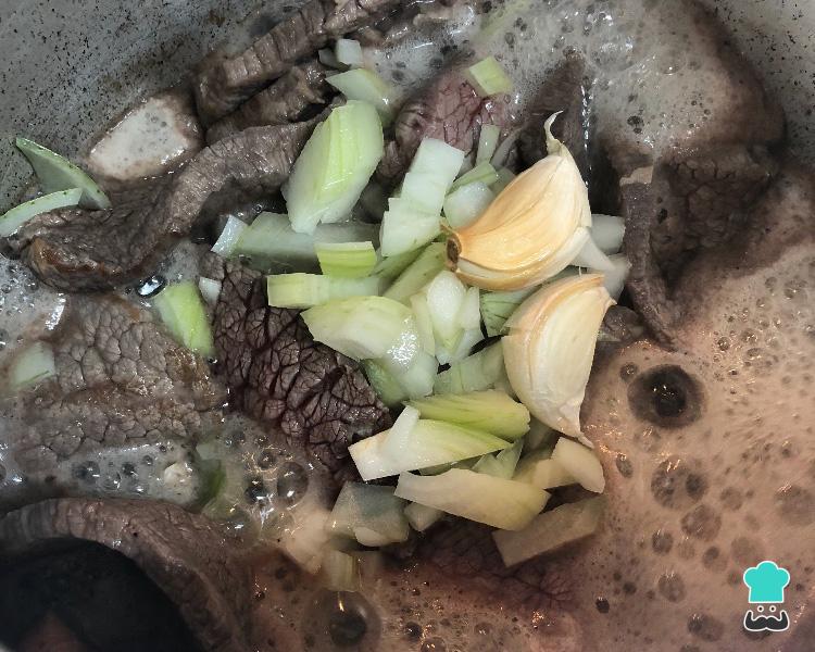 Refogue bem o lagarto na pressão até a carne mudar de cor e, seguidamente, adicione a cebola picada e os dentes de alho amassados com casca.
