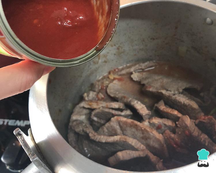 Por último acrescente o tomate pelado amassado. Feche a panela de pressão e cozinhe por 30 minutos depois de pegar a pressão.