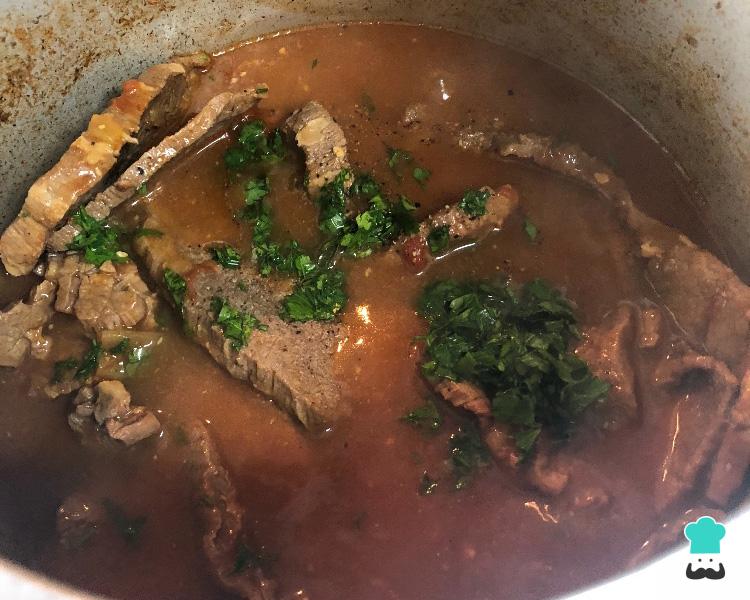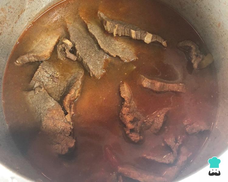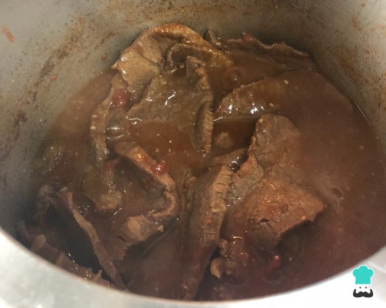 Tire a pressão e abra a panela.Usando um garfo ou faca veja se o lagarto de panela está macio e, se ainda não estiver, deixe cozinhar mais um pouco.