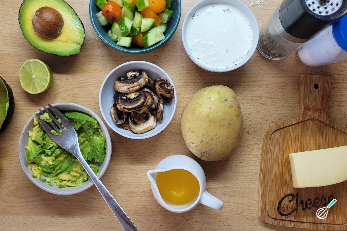 Separe os ingredientes para fazer seu lanche com batata. O recheio aqui é apenas uma sugestão. Essa receita é perfeita para você rechear com aquelas sobras da geladeira - vegetais refogados, frango desfiado, carne moída...