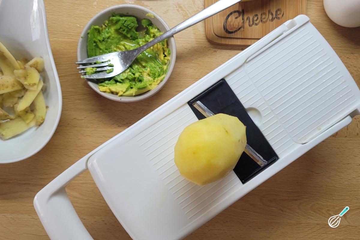 Descasque e corte a batata em rodelas. O segredo para a receita dar certo e ficar bem crocante é cortar a batata bem fininha. O mais fácil é usar um mandolim.