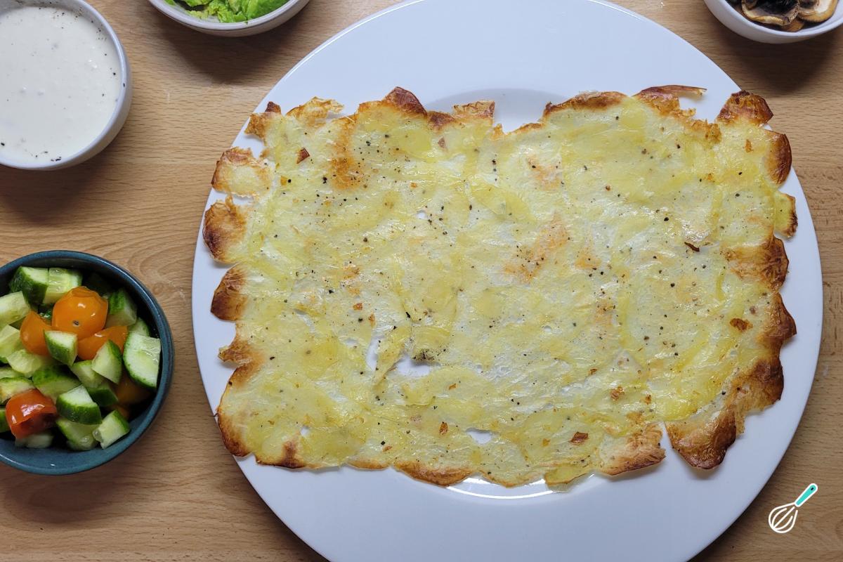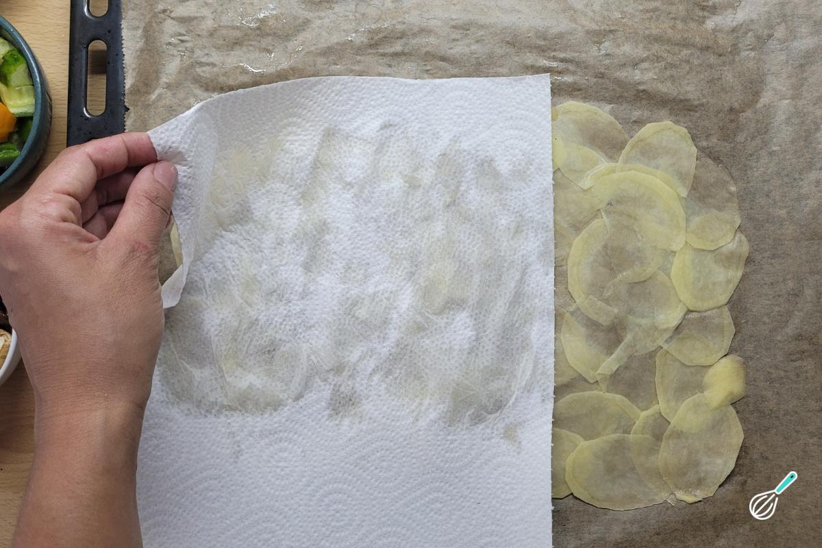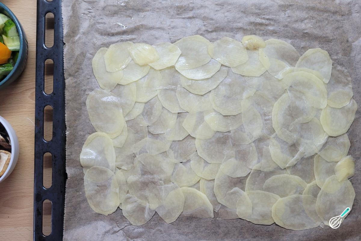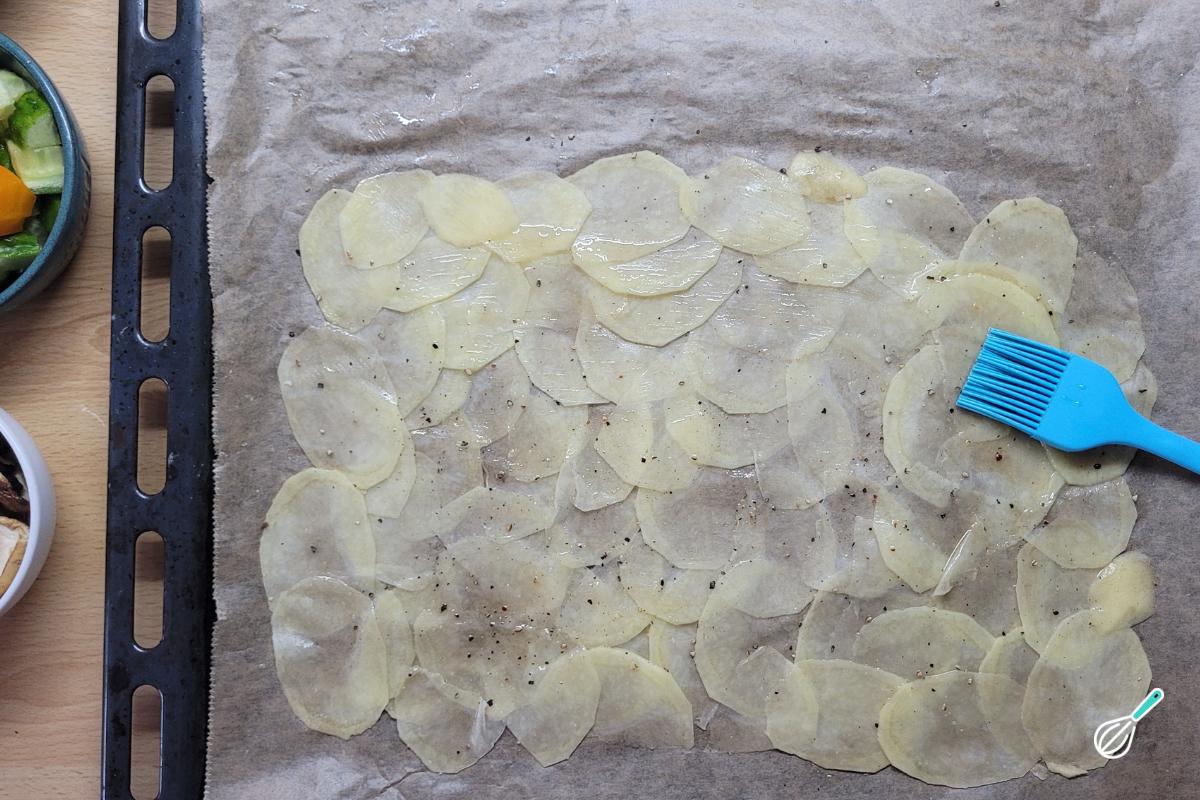 Espalhe as rodelas de batata sobre uma assadeira com papel antiaderente sobrepondo um pouco formando como se fossem escamas. No meu caso, coloquei todas as rodelas de batata juntas para formar uma "folha" única, que depois dobrei para rechear. Se preferir, você pode fazer folhas menores separadas - uma que vai servir como base do sanduíche e outra para cobrir.