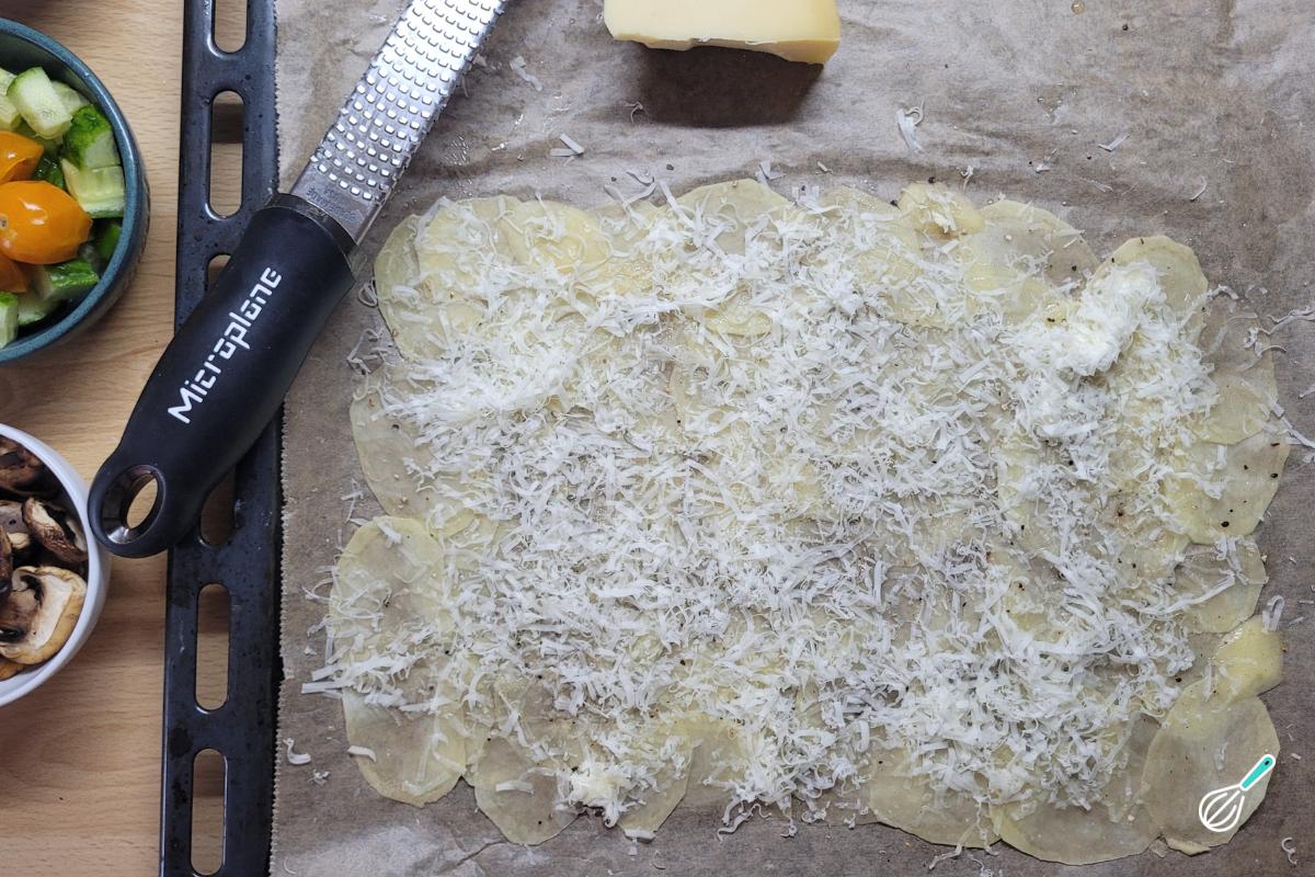 Por último, cubra com queijo ralado. Gosto de ralar no ralo fininho do ralador porque assim dá para espalhar melhor. Leve ao forno pré-aquecido a 200oC até ver que está dourado e as batatas estão prontas. Fique de olho para não queimar porque o processo é rápido, especialmente se suas rodelas de batata estiverem bem fininhas iguais à minha.