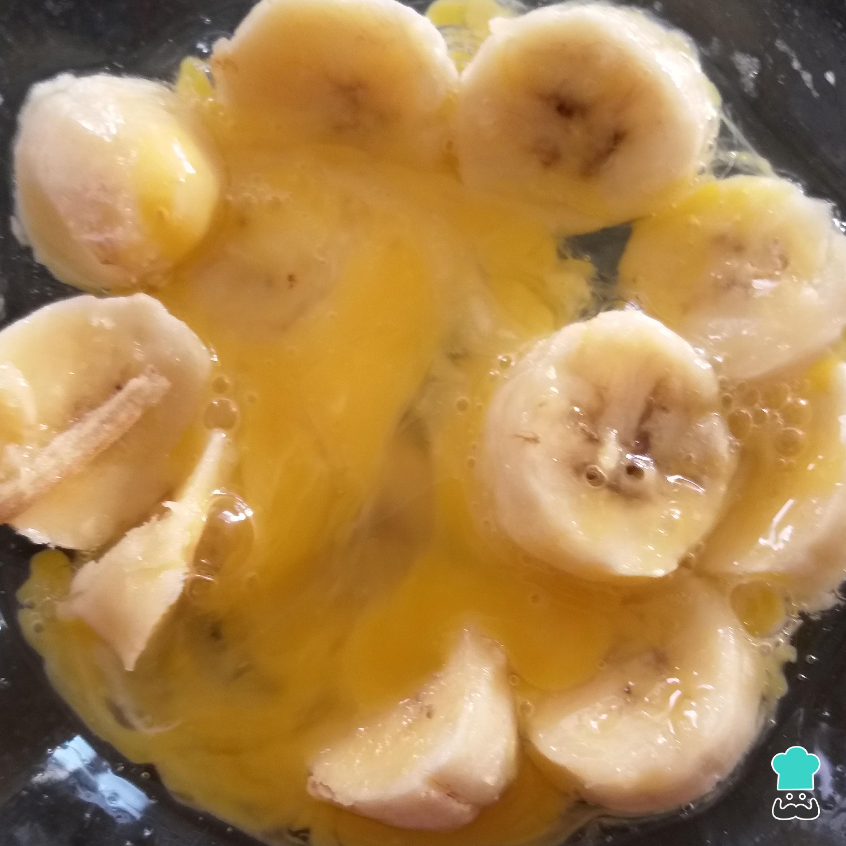 Descasque a banana, corte em rodelas e coloque numa tigela. Amasse com um garfo, acrescente o ovo (clara e gema) e misture bem, manualmente. Neste momento pré-aqueça o forno nos 180ºC.