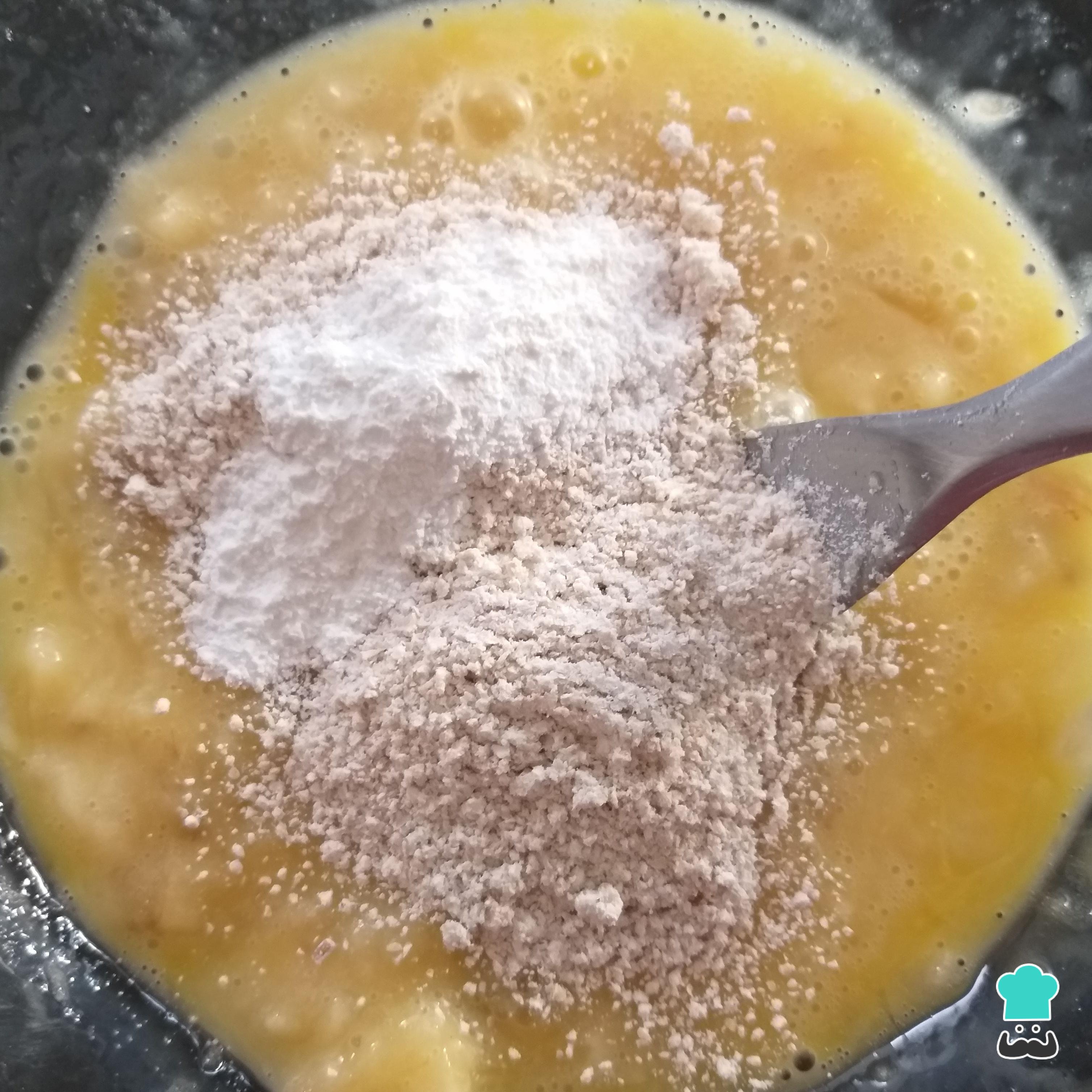Coloque a farinha e o fermento e mexa delicadamente, como se estivesse preparando uma massa de panqueca de banana e aveia.