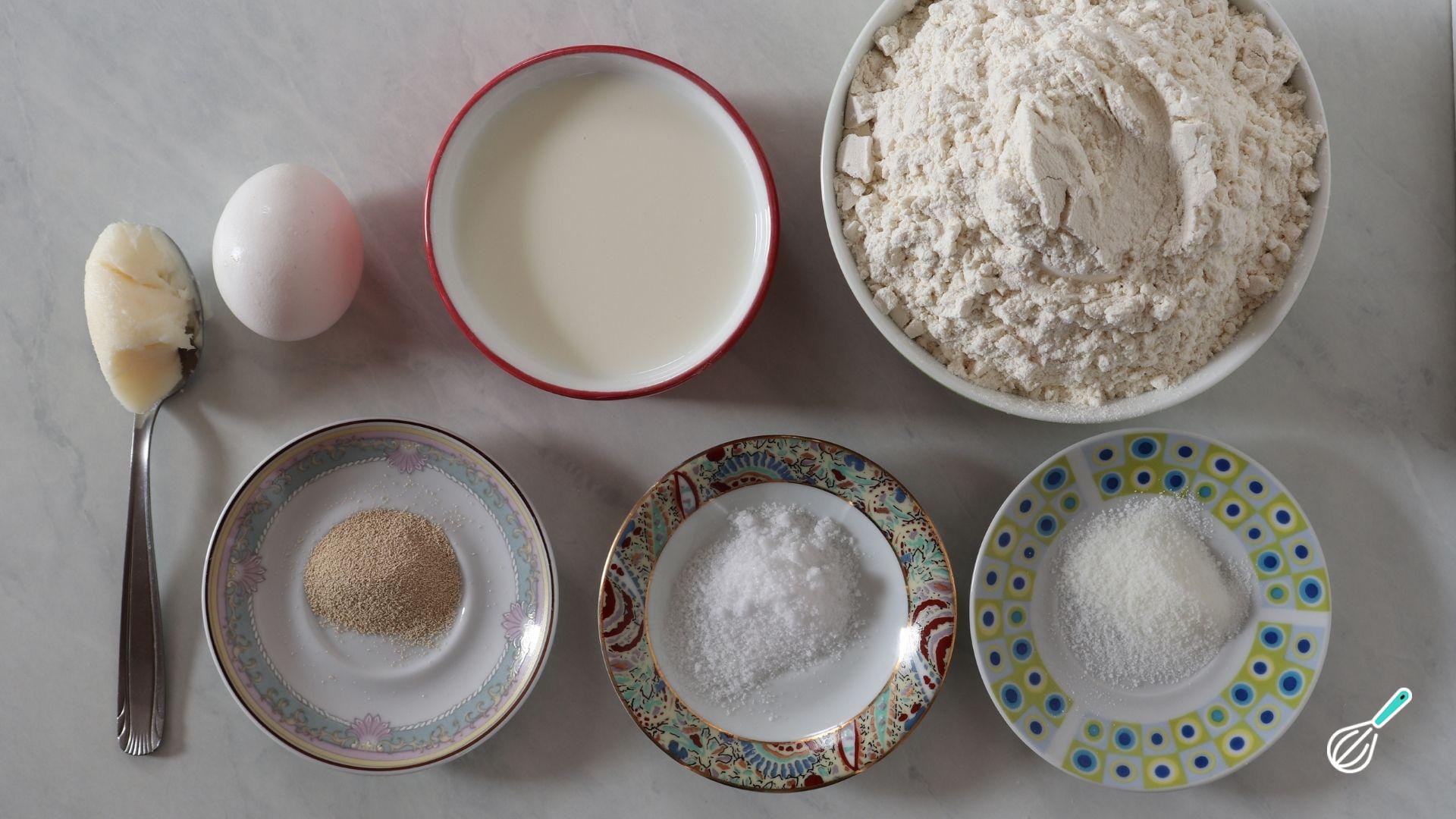 Vamos começar pelo preparo do pão de hambúrguer, então separe os ingredientes. O ovo, o leite e banha de porco devem estar em temperatura ambiente.