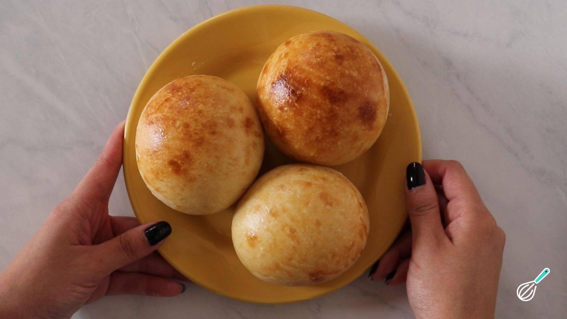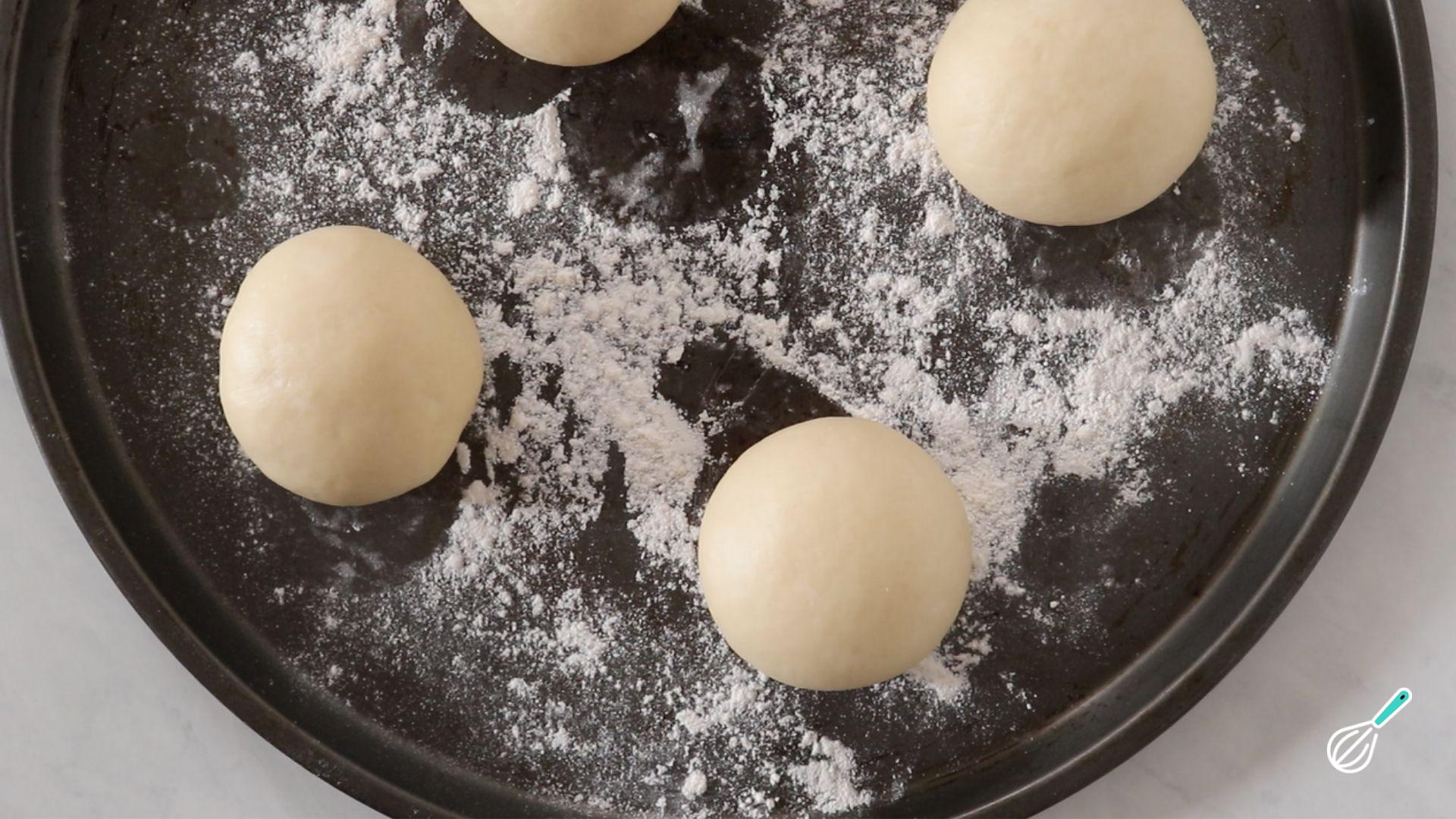 Divida a massa no tamanho que desejar (essa receita rende mais ou menos 6 pães com 100g cada). Enrole cada porção em uma bola bem apertadinha, lisa e modelada e coloque em uma forma antiaderente ou enfarinhada com espaço entre eles. Cubra novamente e deixe crescer por 20 minutos.