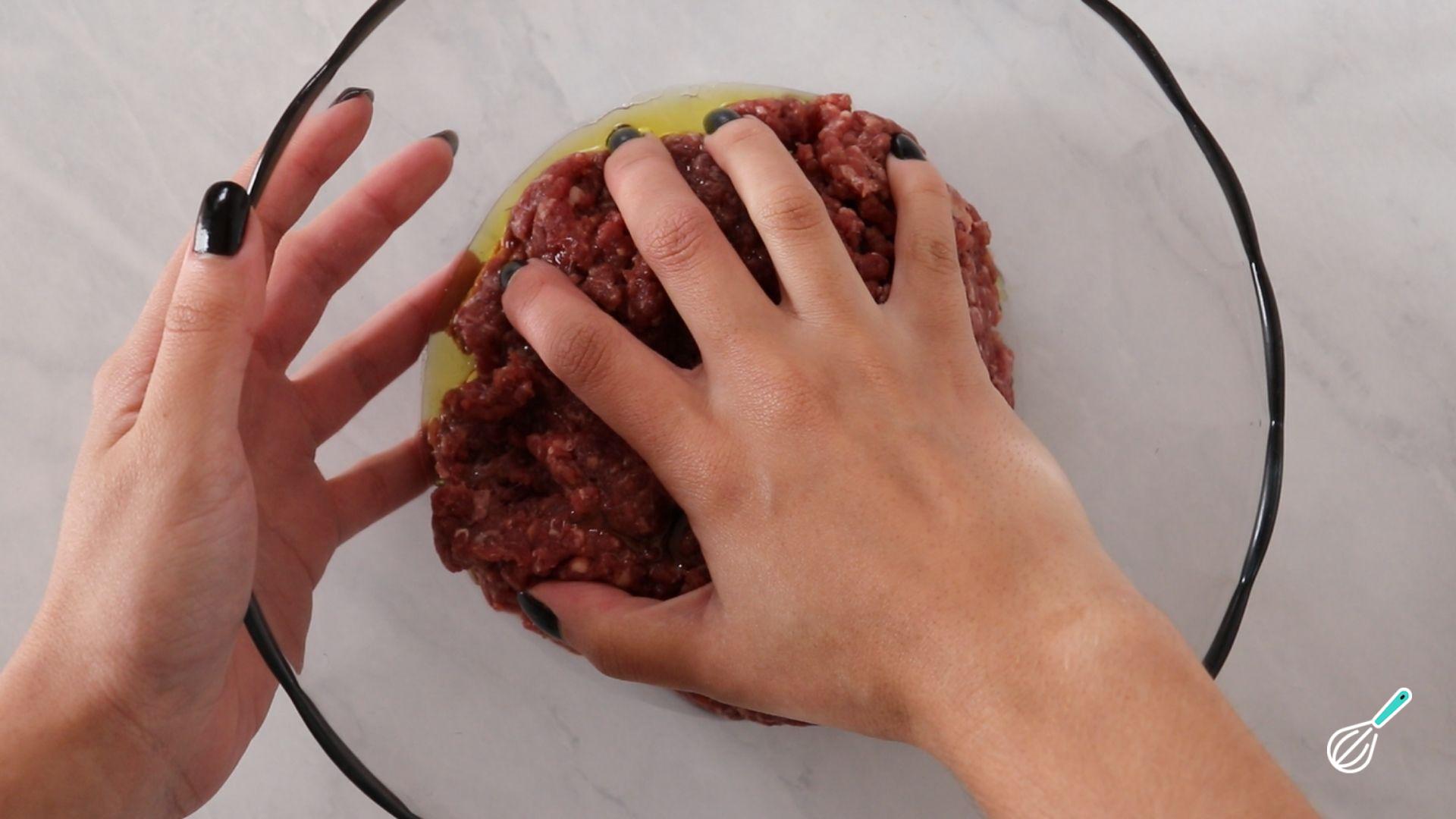 Coloque a água e o azeite na carne e misture (com as mãos mesmo, tá gente?).