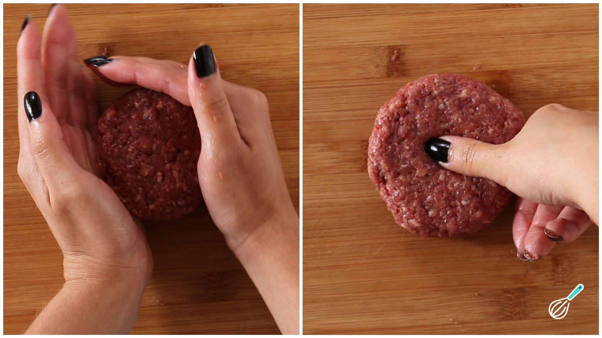 Em seguida use a sua bancada para modelar o seu hambúrguer: separe uma porção, acerte as laterais e forme um "muro" para o hambúrguer ficar bem alto. Agora faça uma marca no meio com o polegar para que ele fique retinho e não “estufe” no centro na hora de fritar.