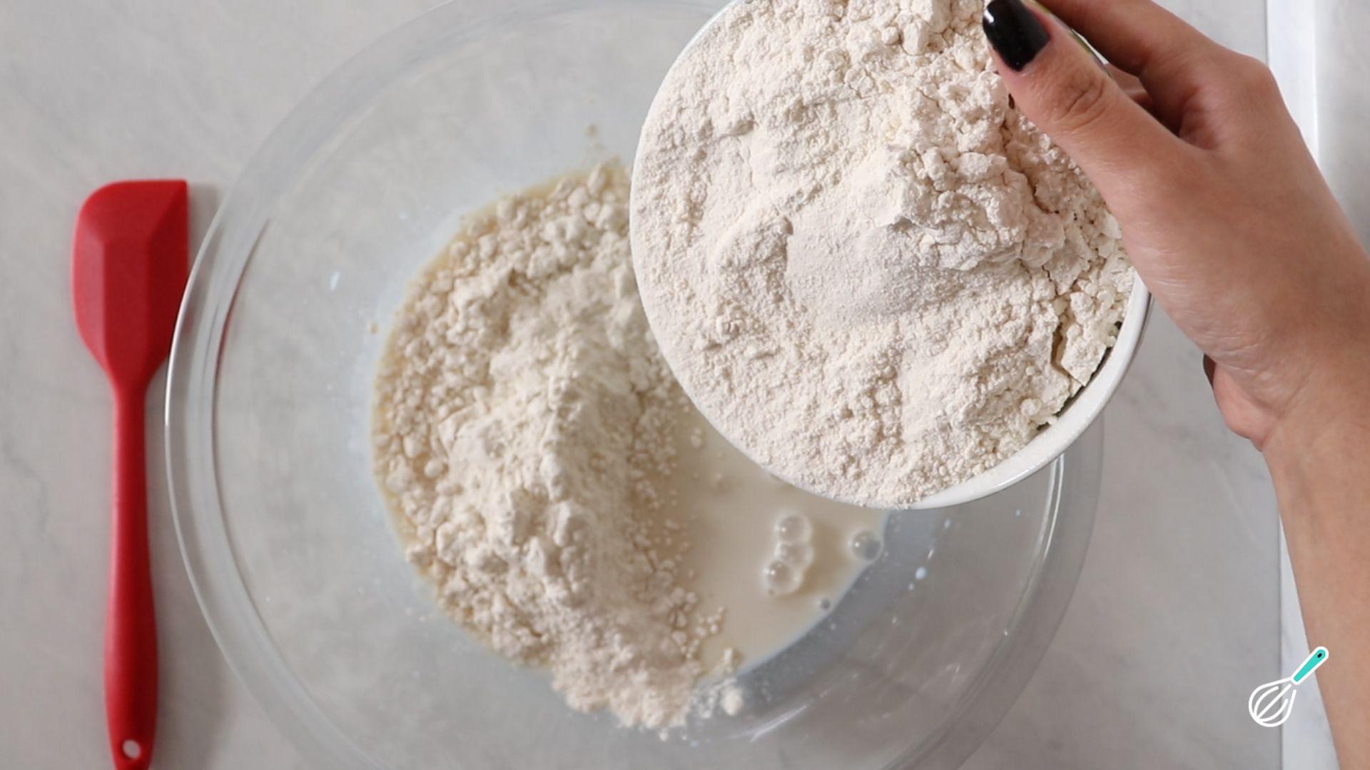 E seguida adicione toda a farinha e misture bem com uma espátula.