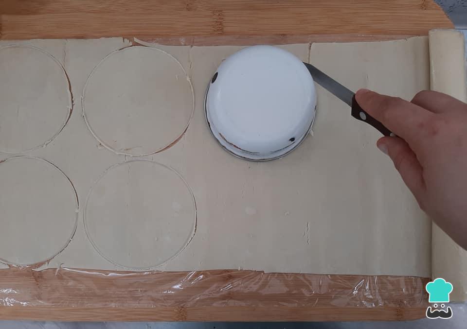 Se estiver usando massa de rolo, utilize um recipiente circular para formar os discos de massa de pastel. Caso esteja usando a massa em discos, pule essa instrução.