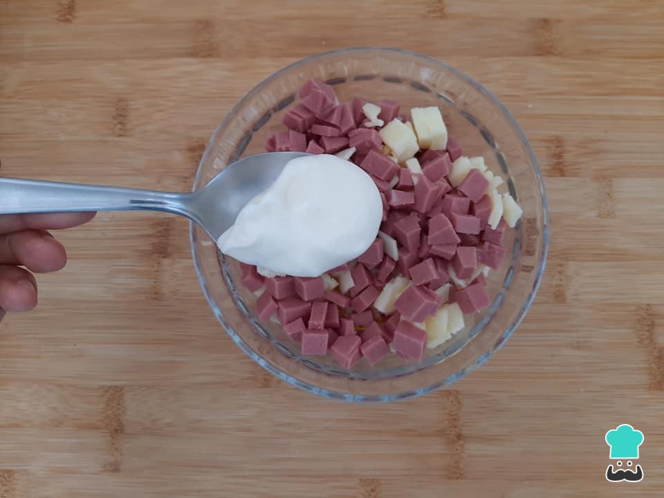Num bowl ou tigela, junte o queijo mussarela, a mortadela e 4 colheres bem cheias de requeijão cremoso, misturando tudo muito bem.