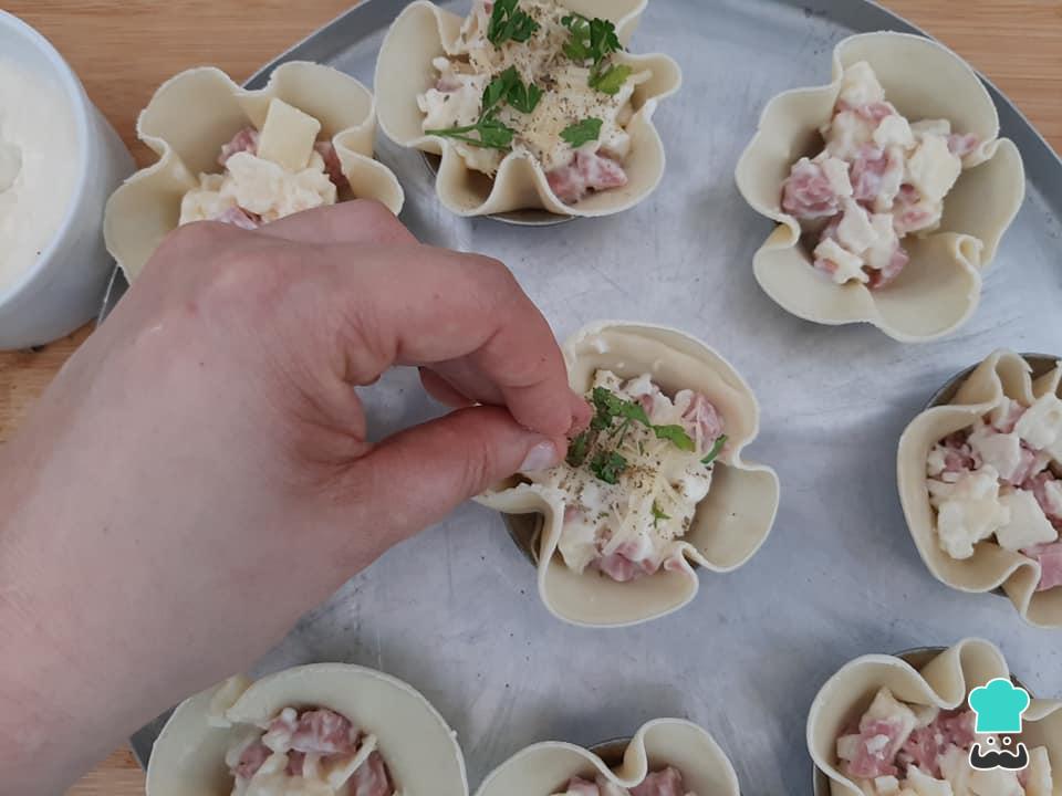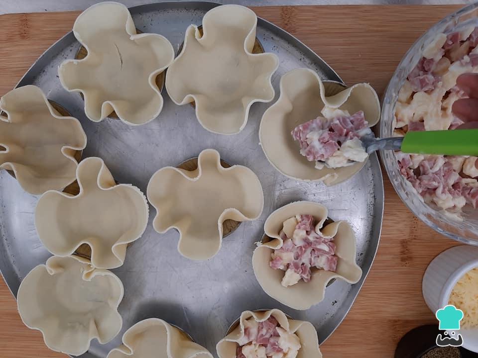Preencha as cestinhas com esse recheio, deixando as bordas da massa sem recheio para que fiquem crocantes após assadas.