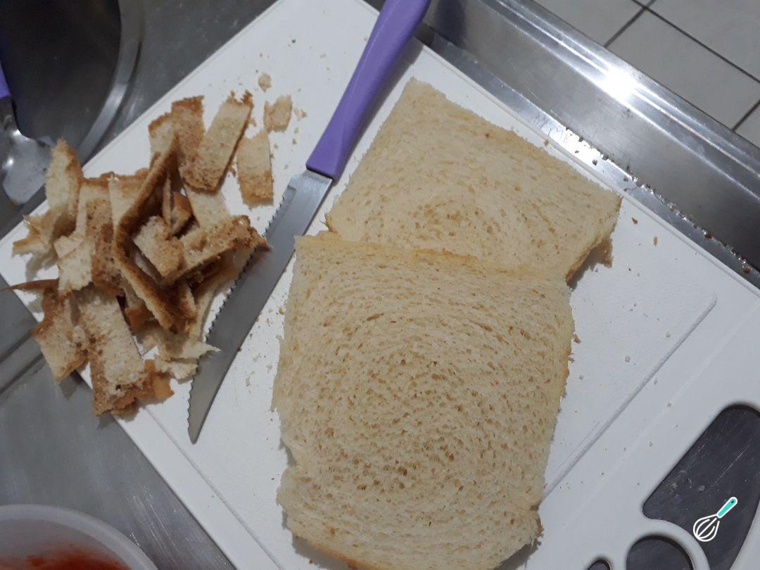 Tire as cascas das fatias de pão com cuidado, para não haver desperdício.
