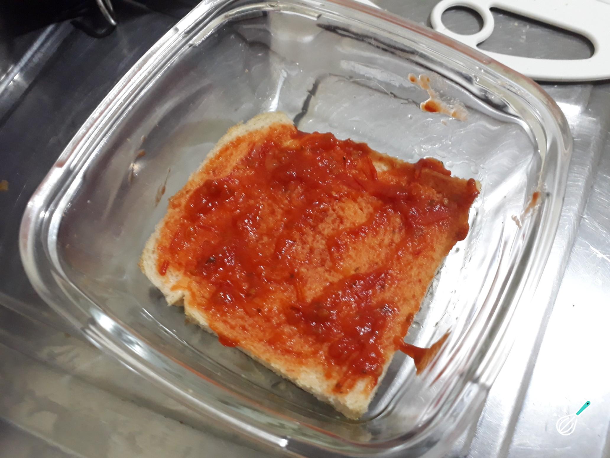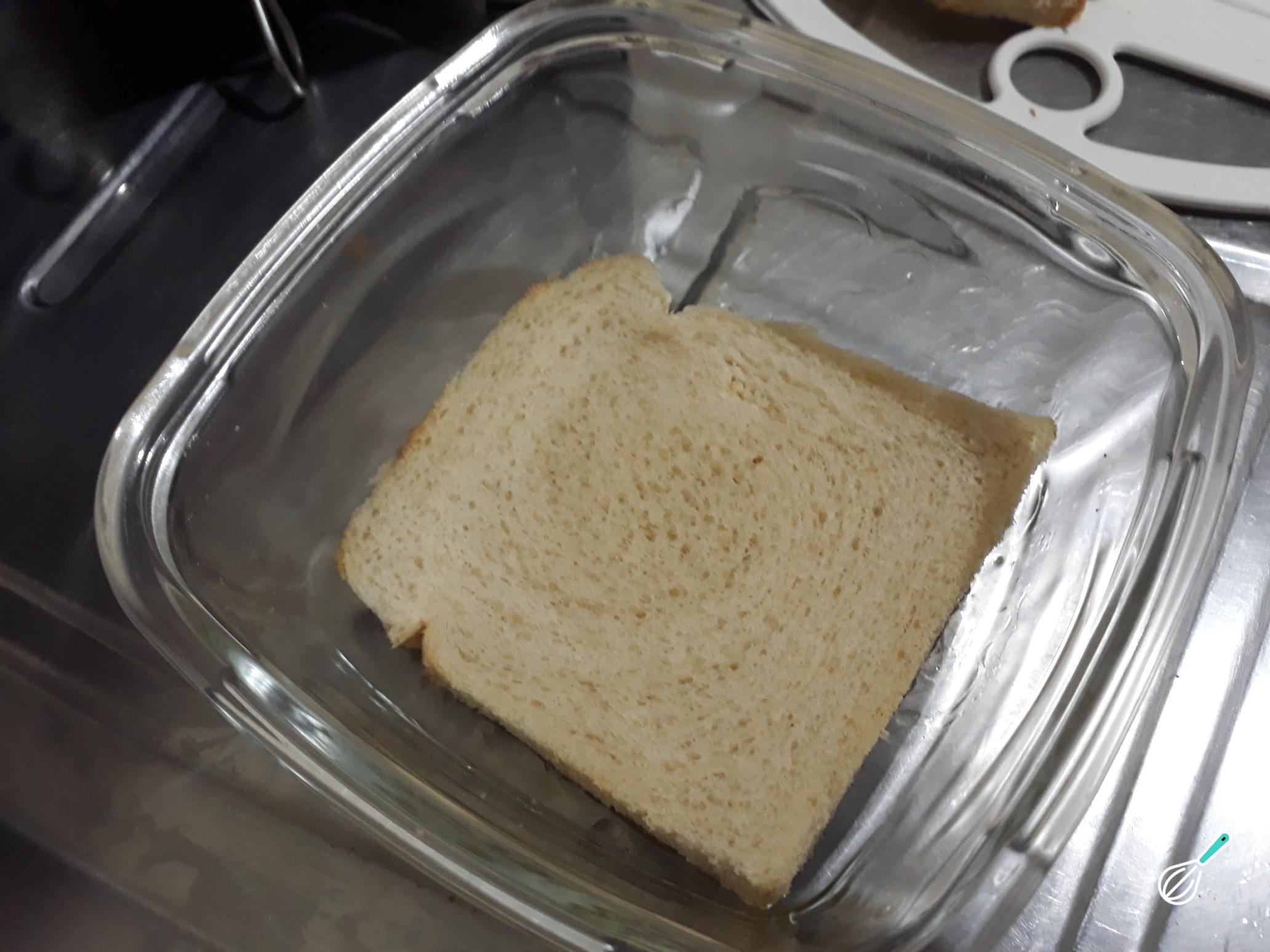 Unte uma travessa de vidro (daquelas que vão no forno) com manteiga e ajeite uma fatia de pão.