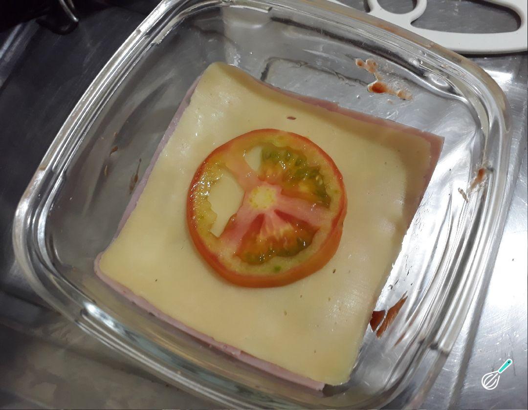 Acrescente uma fatia de queijo (usei mussarela) e uma rodela de tomate.