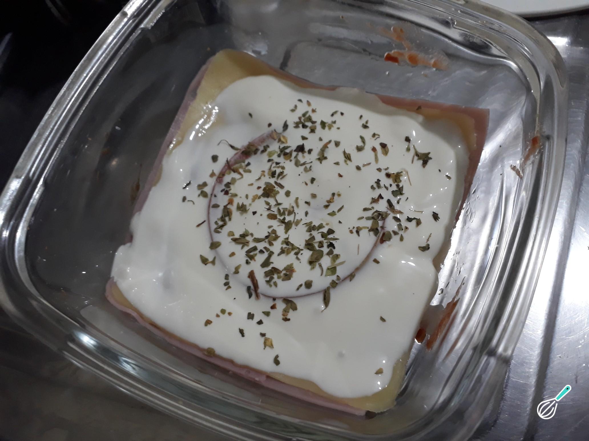 Repita as camadas anteriores até terminar os ingredientes. Na última, ao invés de terminar com o creme de leite, você irá inverter a ordem, ficará assim: presunto, tomate, creme de leite e queijo. Esse detalhe é importante para que o seu lanche, quando for ao forno, possa gratinar e ficar com um aspecto lindo!