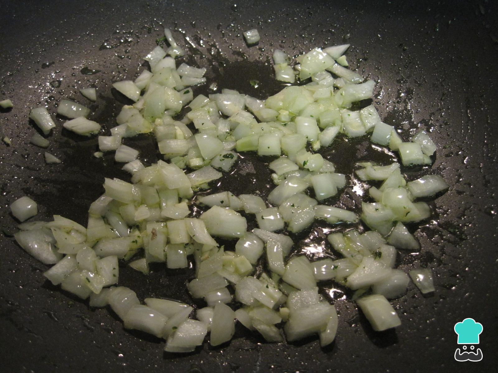 Comece por picar finamente a cebola e o alho. Em seguida, numa frigideira com óleo em fogo médio, refogue estes dois ingredientes. Quando começarem a dourar, adicione um pouco de água e mexa.