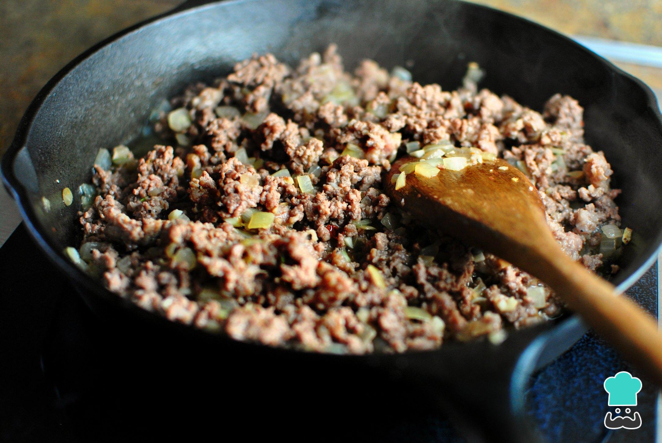 Em seguida, adicione a carne moída à frigideira e fique mexendo, para cozinhar toda a carne por igual. O tempo de cozimento será de 20-30 minutos.