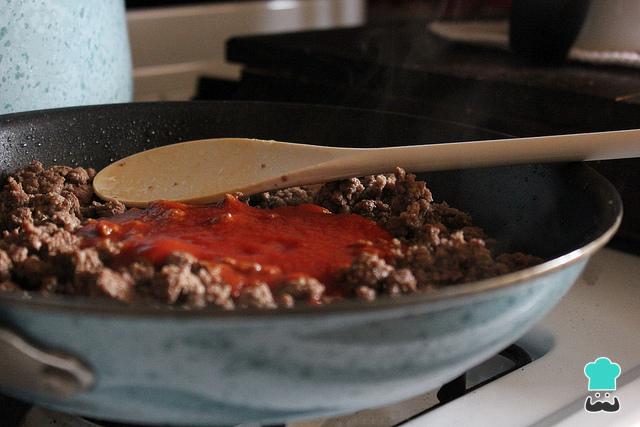 Após este tempo, o passo seguinte da lasanha à bolonhesa é juntar os tomates, o molho de tomate e temperar com sal e pimenta. Misture bem, aumente para fogo alto e cozinhe tudo por mais 5 minutos. Quando você vir que a carne está pronta, prove e corrija o sabor se necessário. Desligue o fogo.
