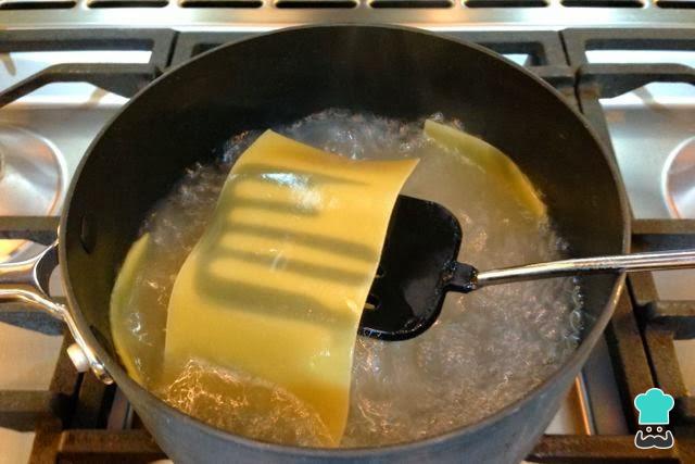 Com a carne já pronta, você pode começar a cozinhar as folhas de massa. Para fazer isto, aqueça bastante água com uma pitada de sal e siga as instruções da embalagem (geralmente uns 8 minutos de cozimento são suficientes).