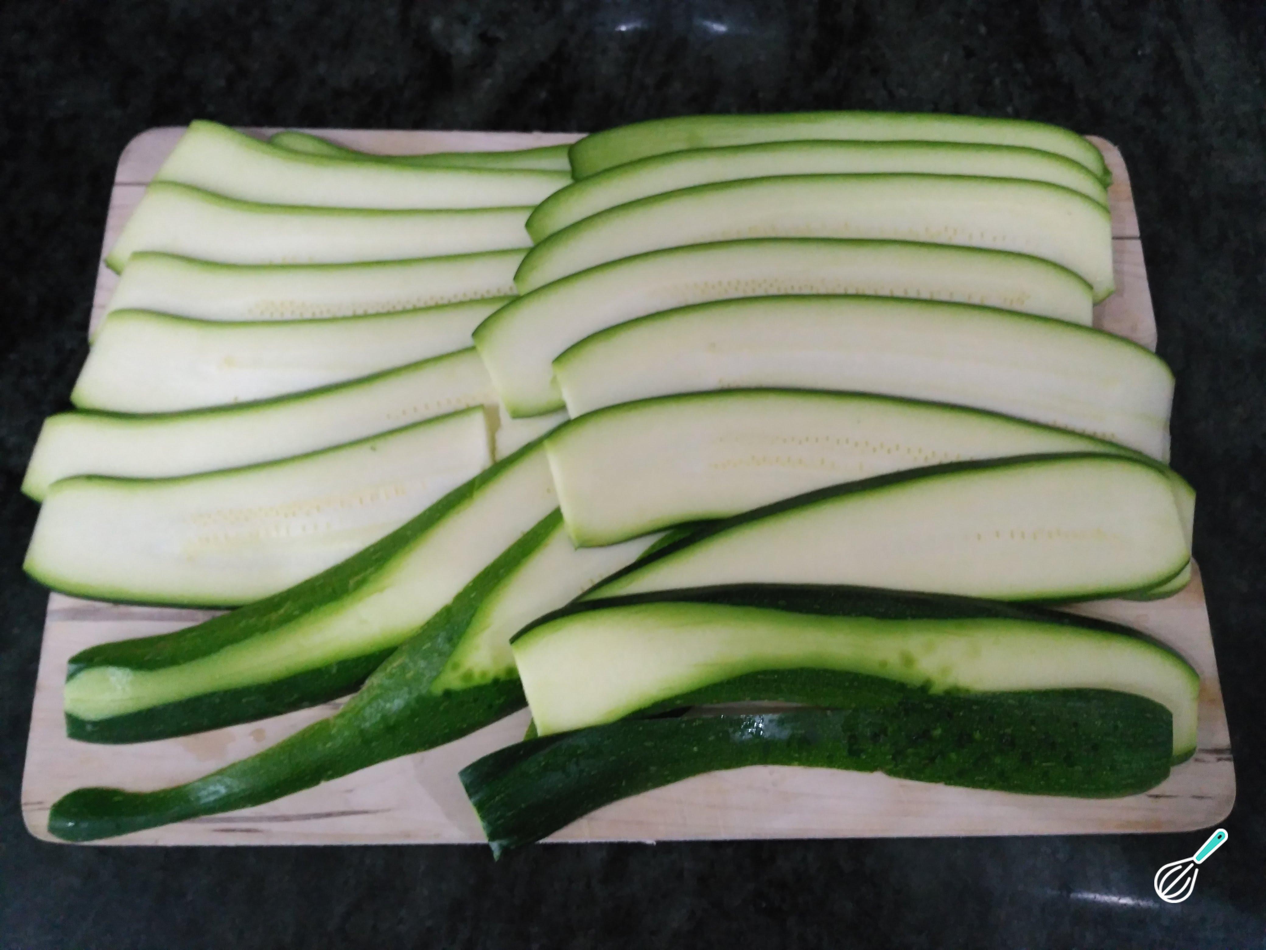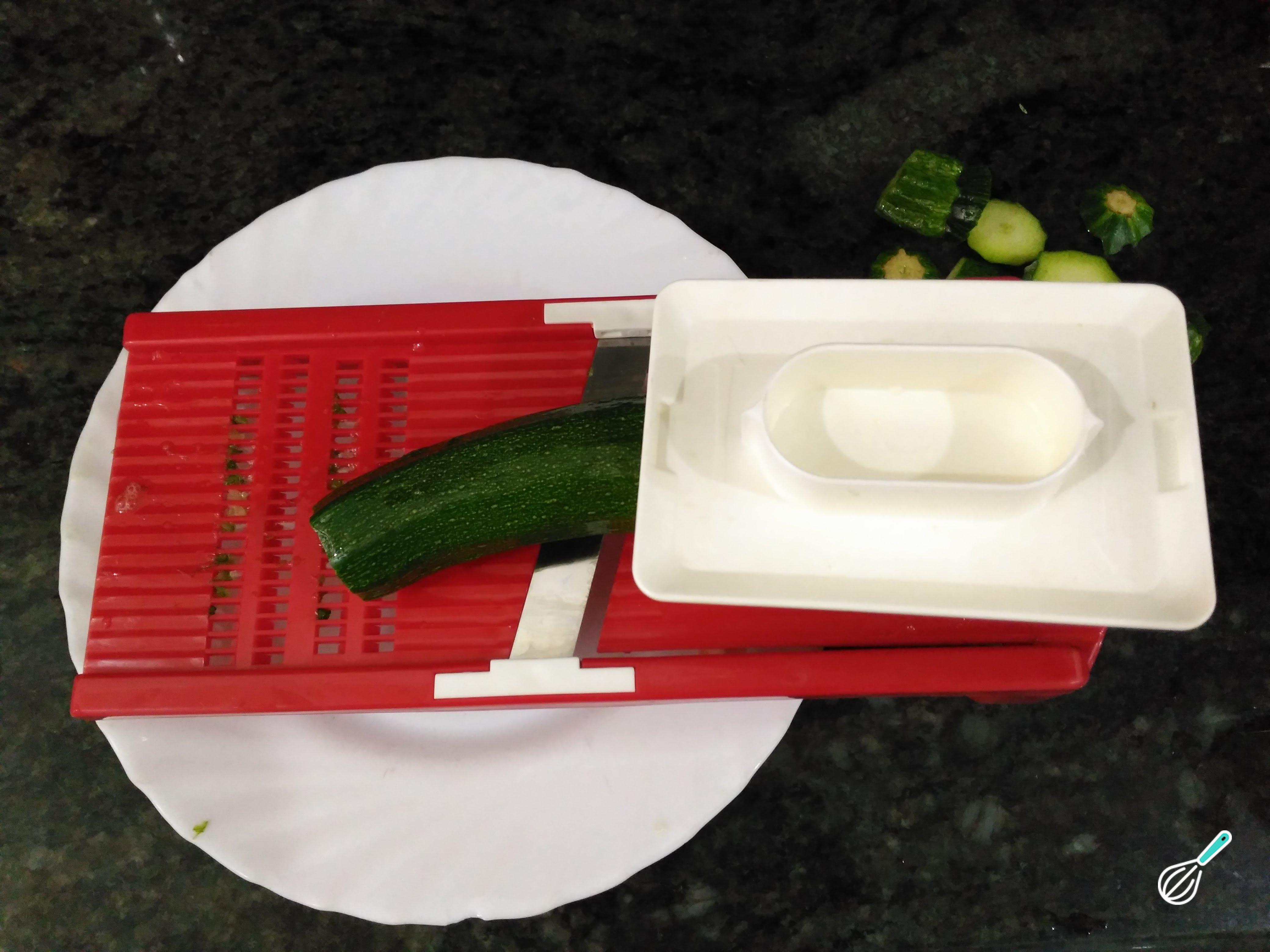 Lave bem as abobrinhas, corte fora dos topos e corte em fatias usando uma mandolina (como na foto) ou uma faca.