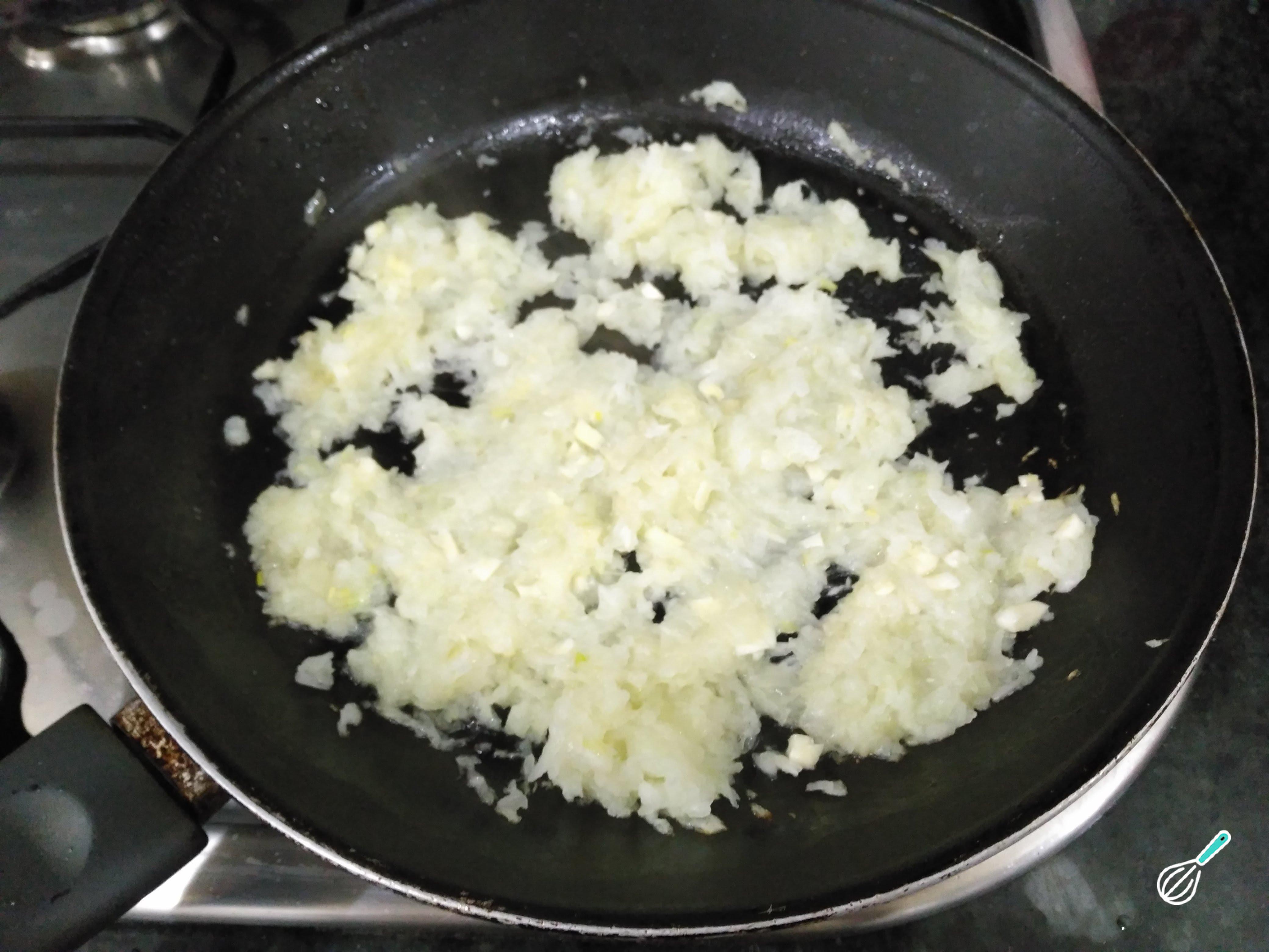 Pique ou rale a cebola e os alhos. Leve ao fogo uma frigideira com um fio de azeite e refogue a cebola e os alhos até ficarem macios.