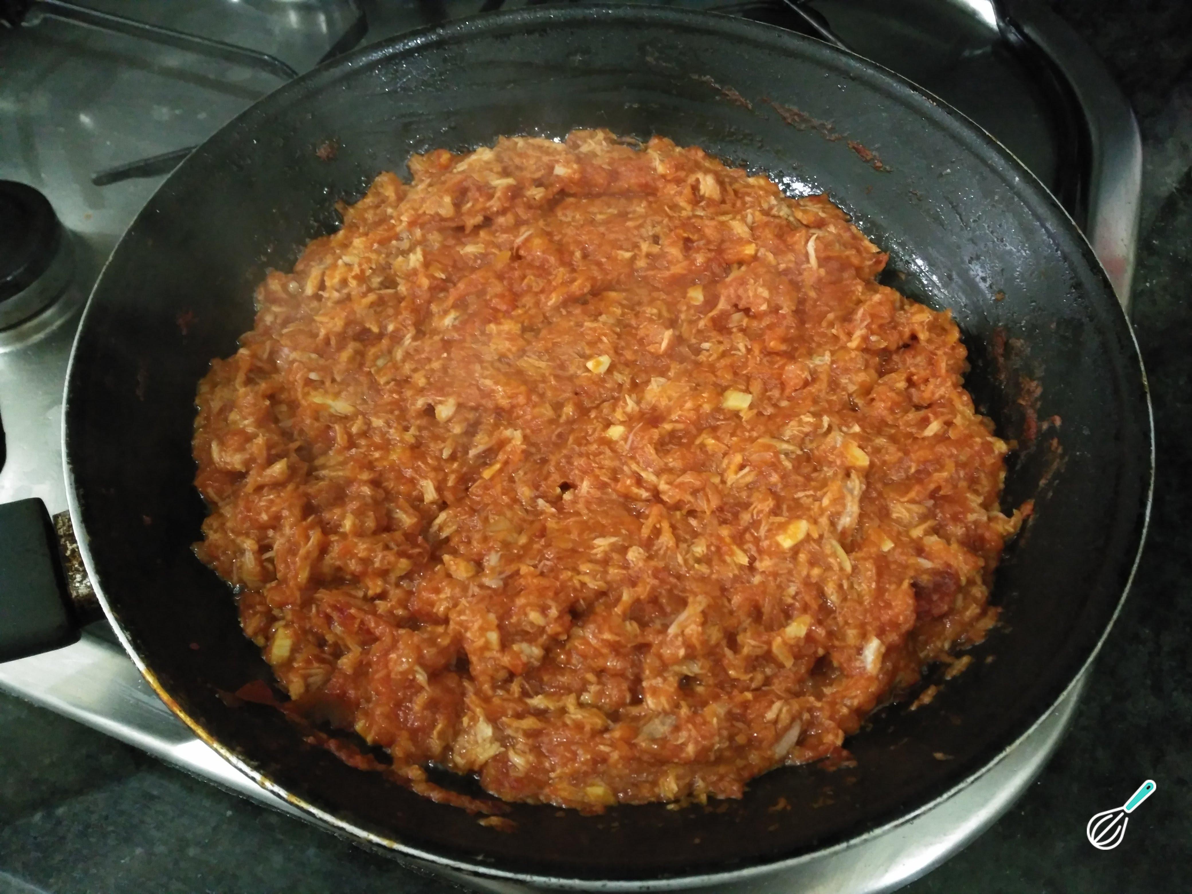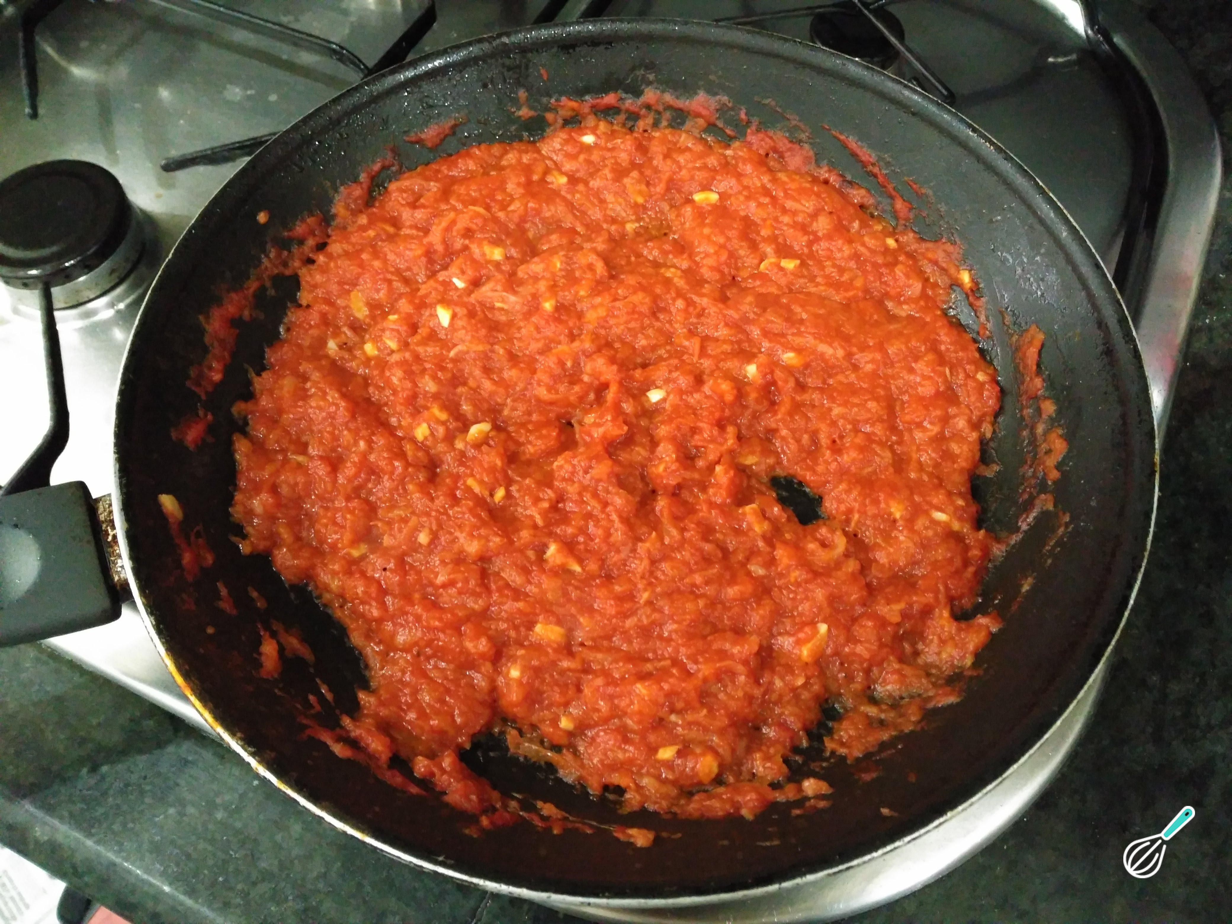 Acrescente o molho de tomate natural ou molho de tomate caseiro e deixe cozinhar por 10 minutos ou até reduzir. Acerte o sabor com sal e pimenta a gosto.