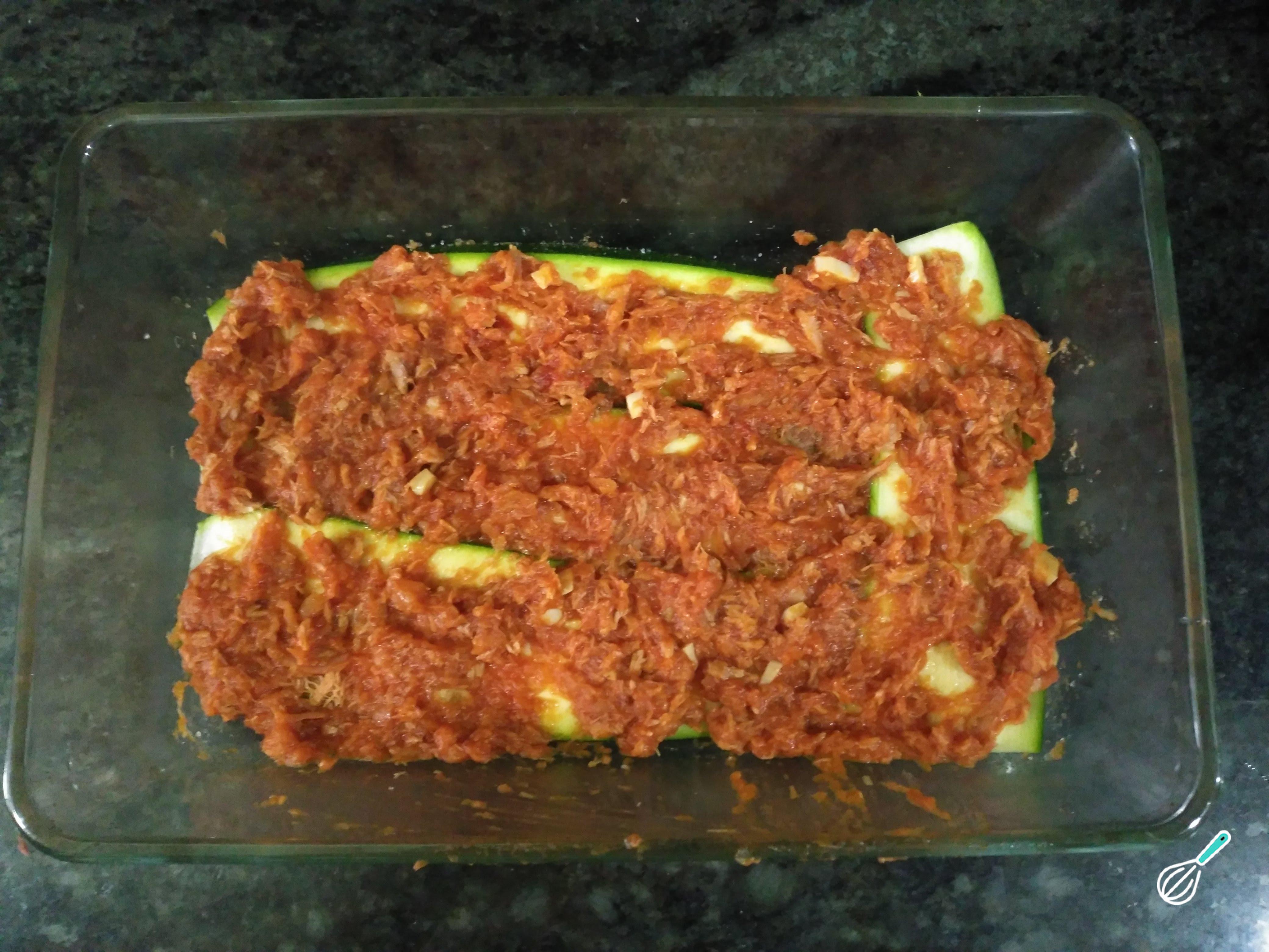 Repita as camadas de abobrinha e atum com molho de tomate até esgotar os ingredientes.