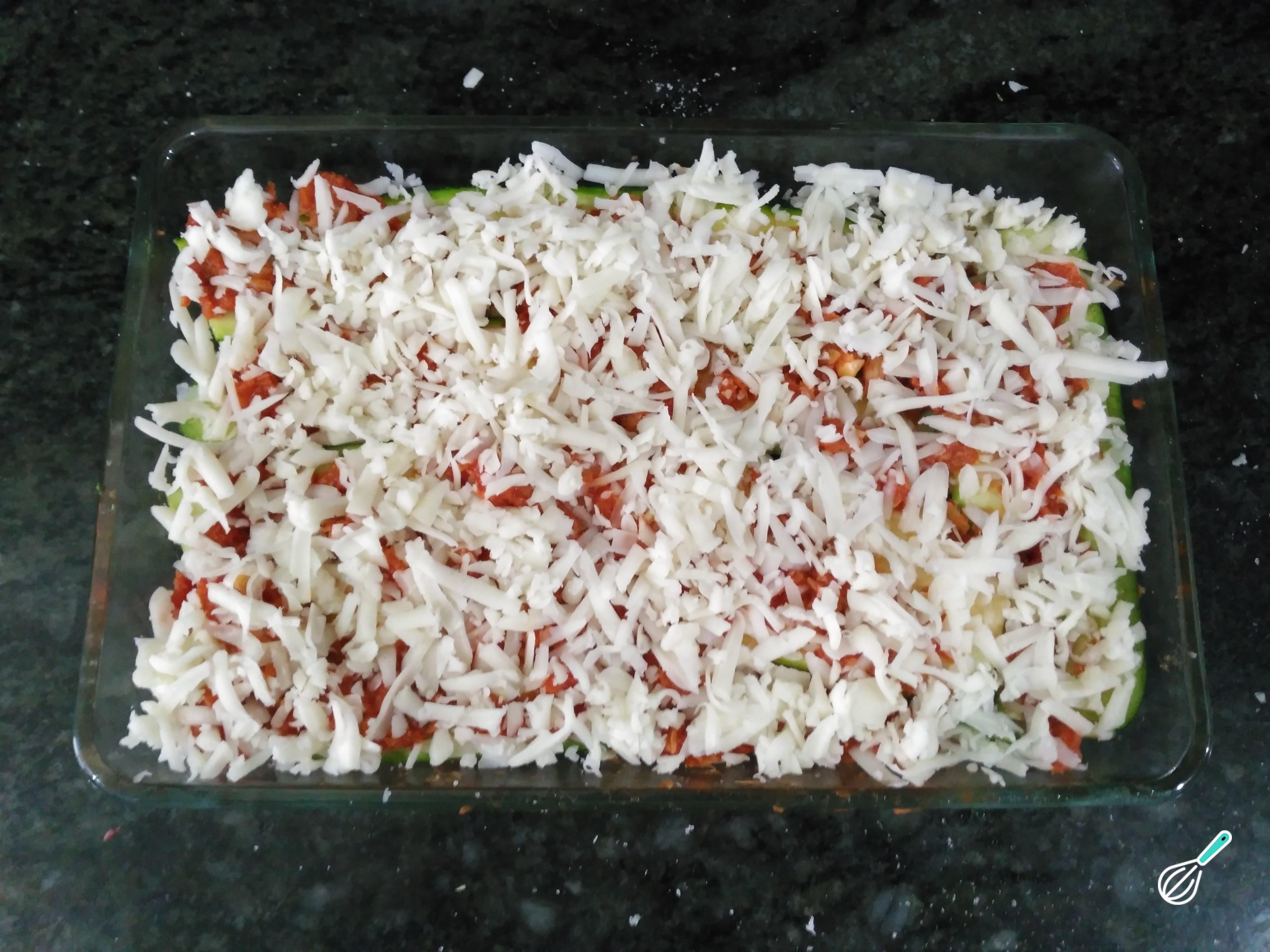 Quando terminar de montar a lasanha de abobrinha e atum, coloque o queijo ralado. Leve ao forno preaquecido a 200ºC (com calor em cima e em baixo) por 20-30 minutos, ou até o queijo derreter e dourar.