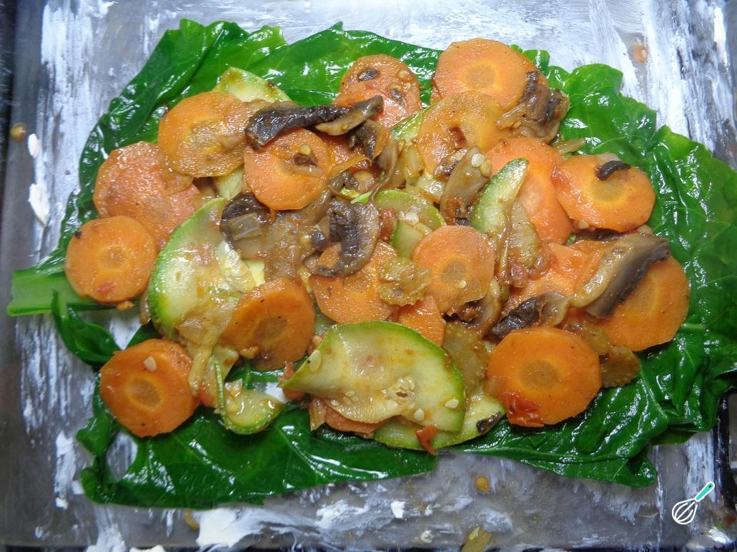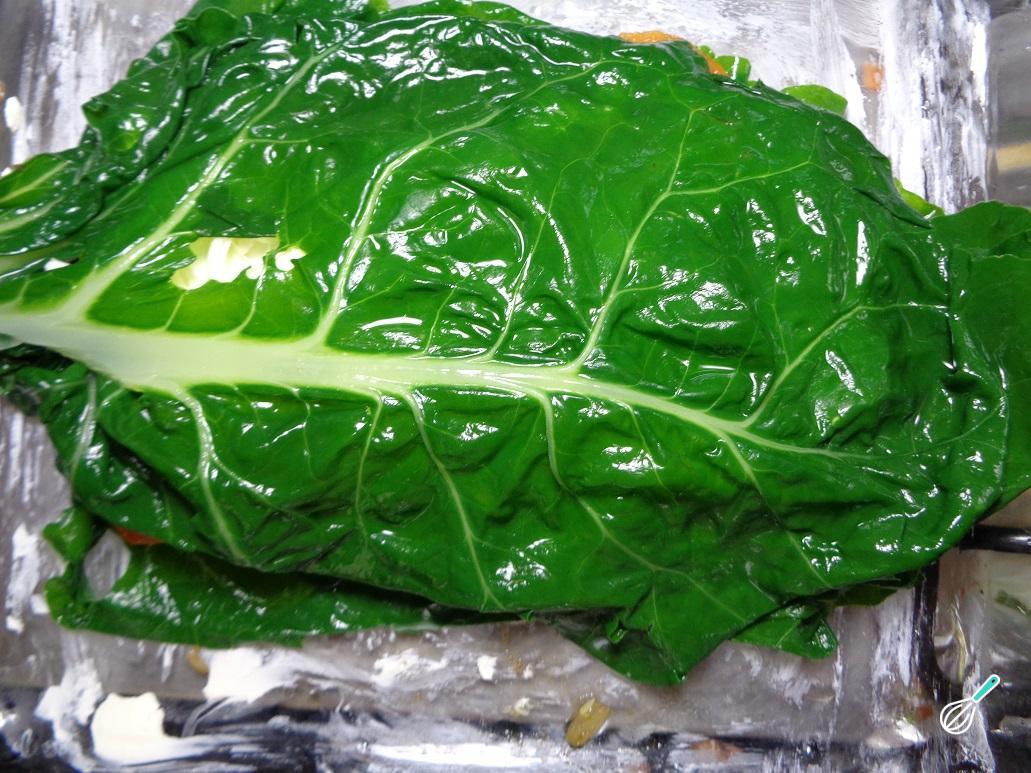Coloque um pouco do recheio de legumes preparados anteriormente sobre a acelga.