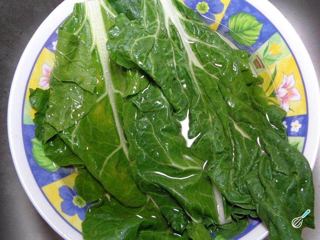 Comece a preparação desta lasanha vegetariana desinfetando bem as folhas de acelga. Remova as folhas do talo, e deixe na água com desinfetante durante 3 minutos. Passado este tempo retire-as da água, escorra e reserve.