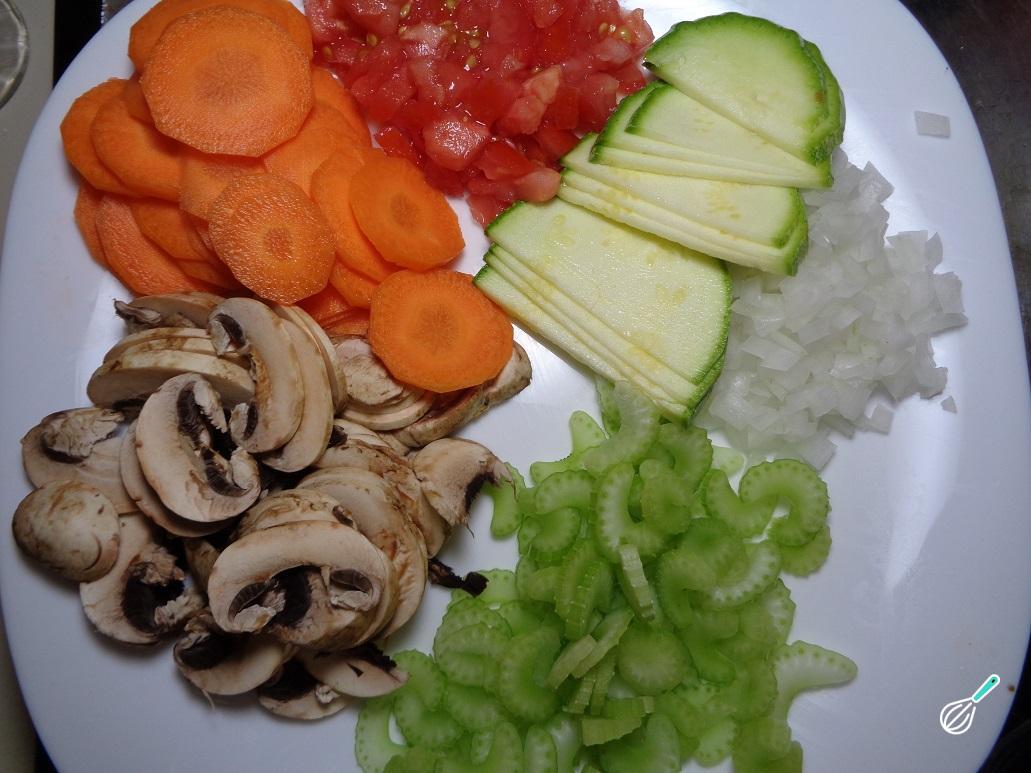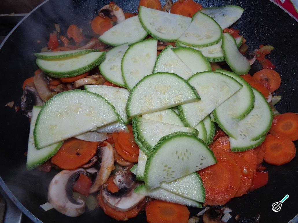 De seguida, adicione os restantes vegetais (tomate em cubinhos, cogumelos, cenoura e abobrinha). Tempere com mais uma pitada de sal e pimenta e deixe cozinhar em fogo médio até todos os legumes ficarem macios, mexendo sempre. Retire do fogo e reserve.