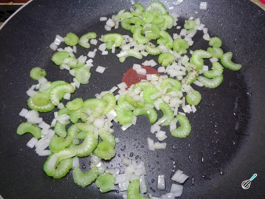 Depois de cortar todos os vegetais, prepare o recheio da lasanha vegetariana. Aqueça uma panela com óleo e junte a cebola picada e o aipo em fatias. Tempere com uma pitada de sal e pimenta do reino e misture, deixando refogar até os ingredientes ficarem transparentes.