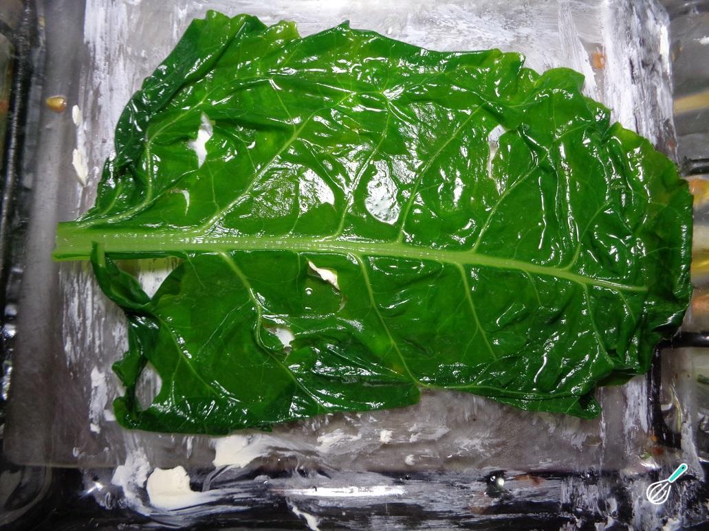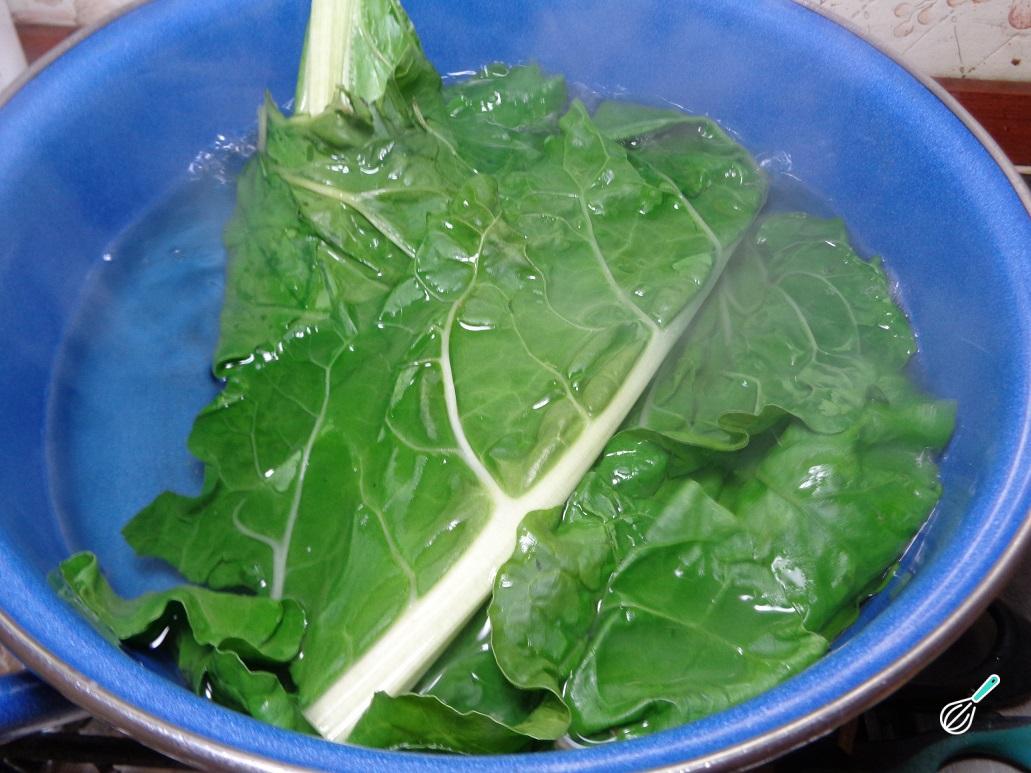 Separadamente, aqueça uma panela grande com água em fogo alto. Quando ferver, adicione as folhas de acelga e cozinhe por três minutos para que suavizem um pouco. Retire a acelga da água, escorra e reserve.