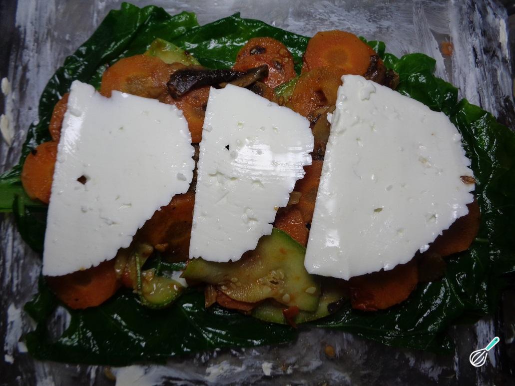 Cubra os legumes com algumas fatias de queijo ricota a gosto, adicionando a quantidade que desejar.