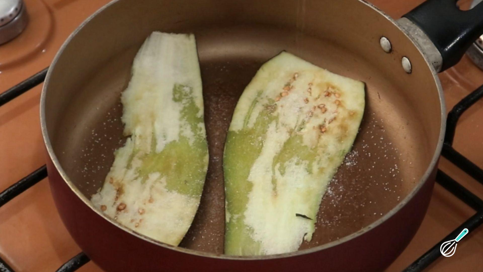 Leve uma panela ao fogo médio, despeje o azeite e coloque as fatias de berinjelas cortadas no sentido do comprimento. Tempere com sal e pimenta a gosto e frite até ficarem sequinhas.
