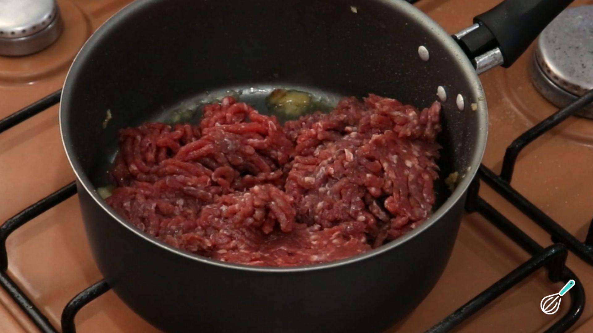 Em seguida leve uma panela também ao fogo médio, despeje o azeite e refogue o alho e a cebola picadas e depois adicione a carne moída, tempere com sal e pimenta e misture bem para pegar o sabor do refogado.