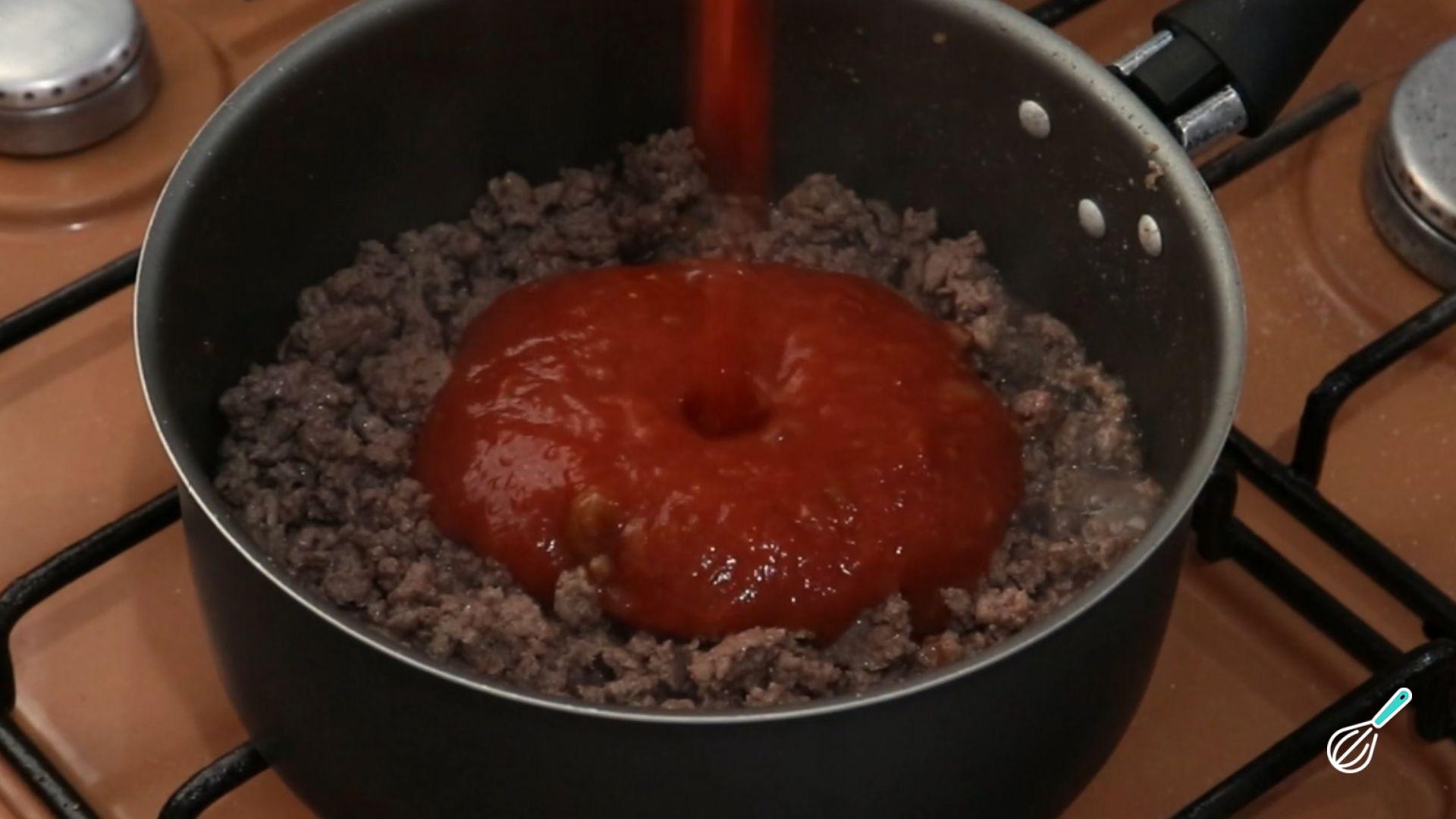 Despeje o molho de tomate e cozinhe por 3 minutos.