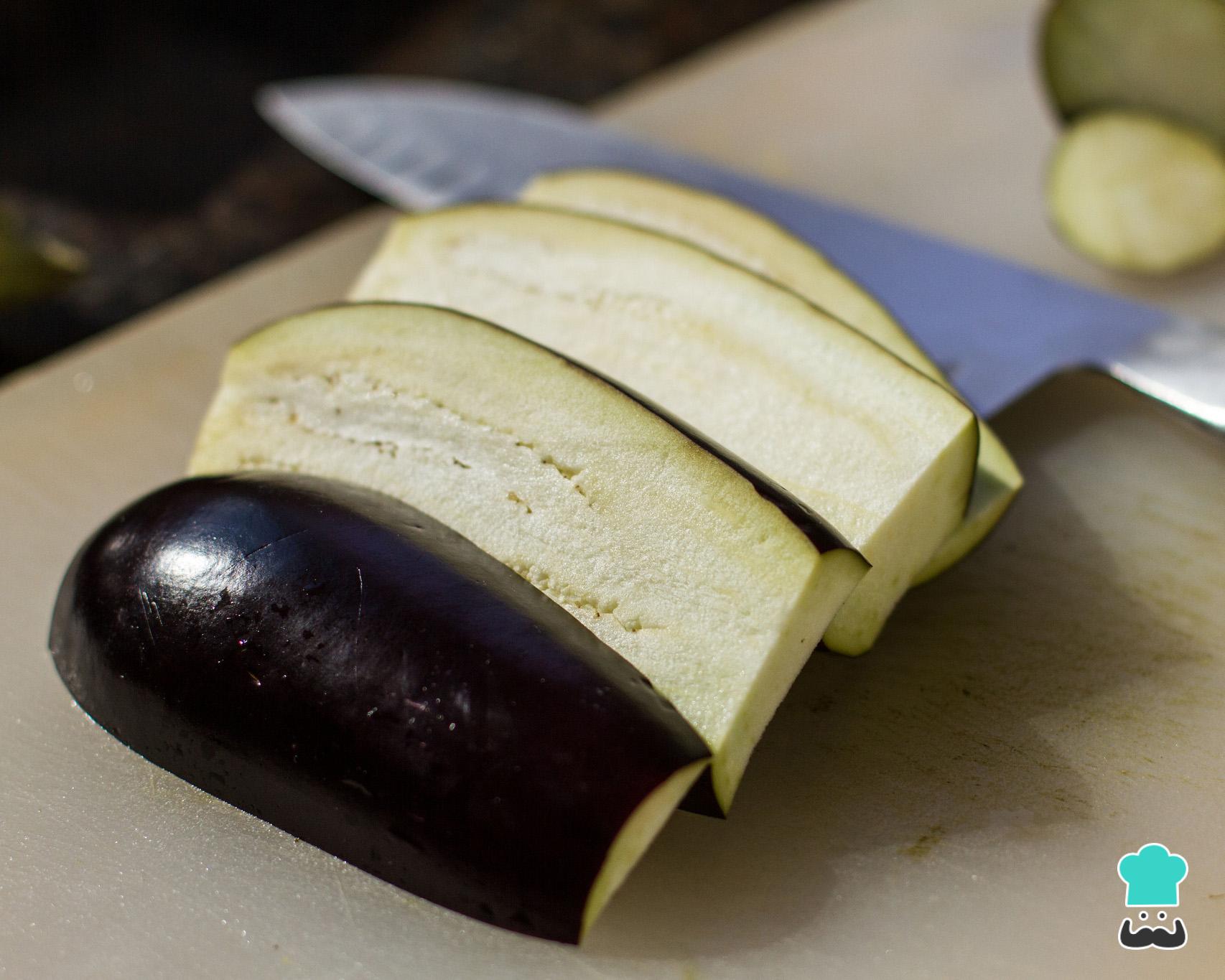 Limpe as berinjelas cortando foras as pontas e cortando cada berinjela em fatias finas com, aproximadamente, 5 mm cada uma.