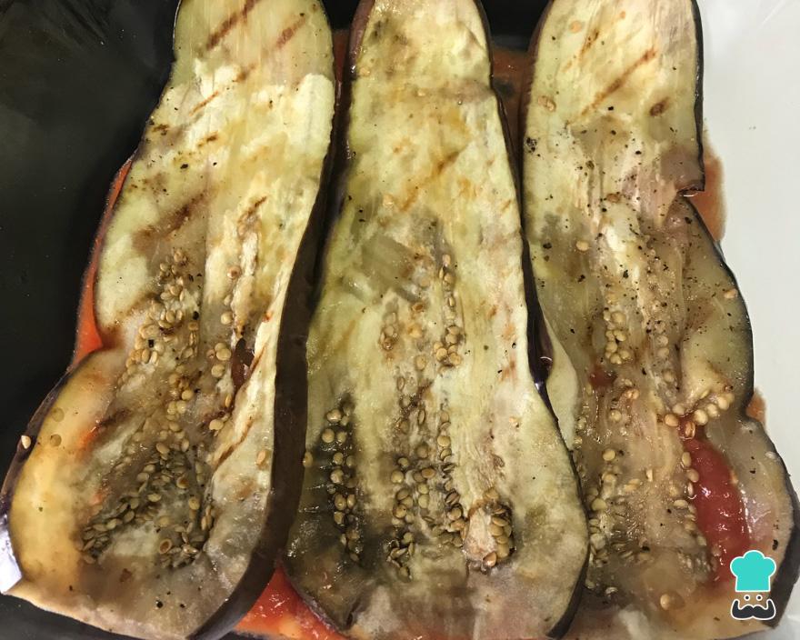 Pincele um pouco de azeite em cada fatia de berinjela e doure as berinjelas numa frigideira ou grelha quente. Não precisa cozinhar muito as berinjelas, somente dourar para que elas cozinhem mais rápido no forno e não libertem água.