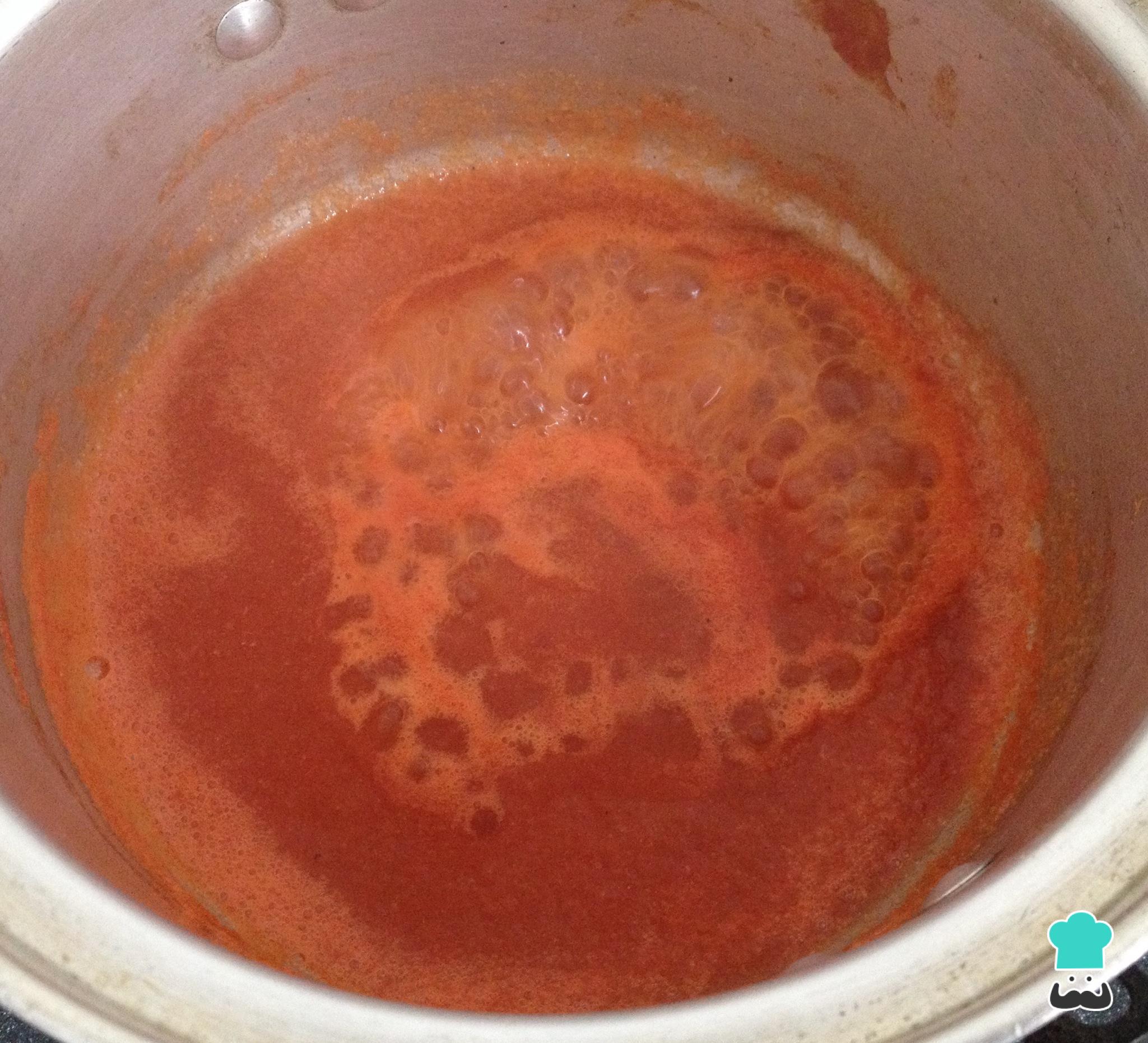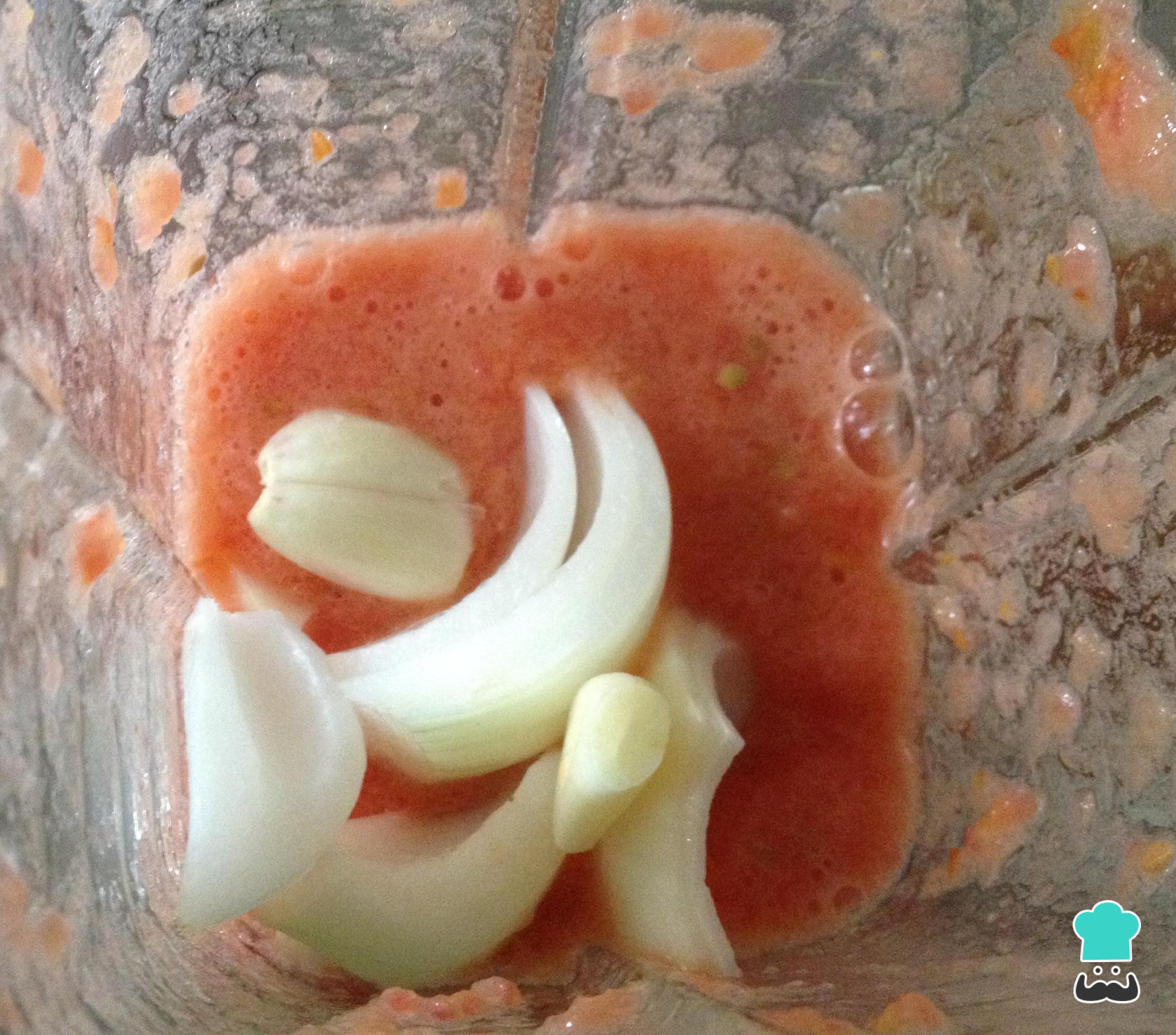 Bata no liquidificador os tomates inteiros juntamente com metade da cebola e o alho, até obter uma mistura homogênea.