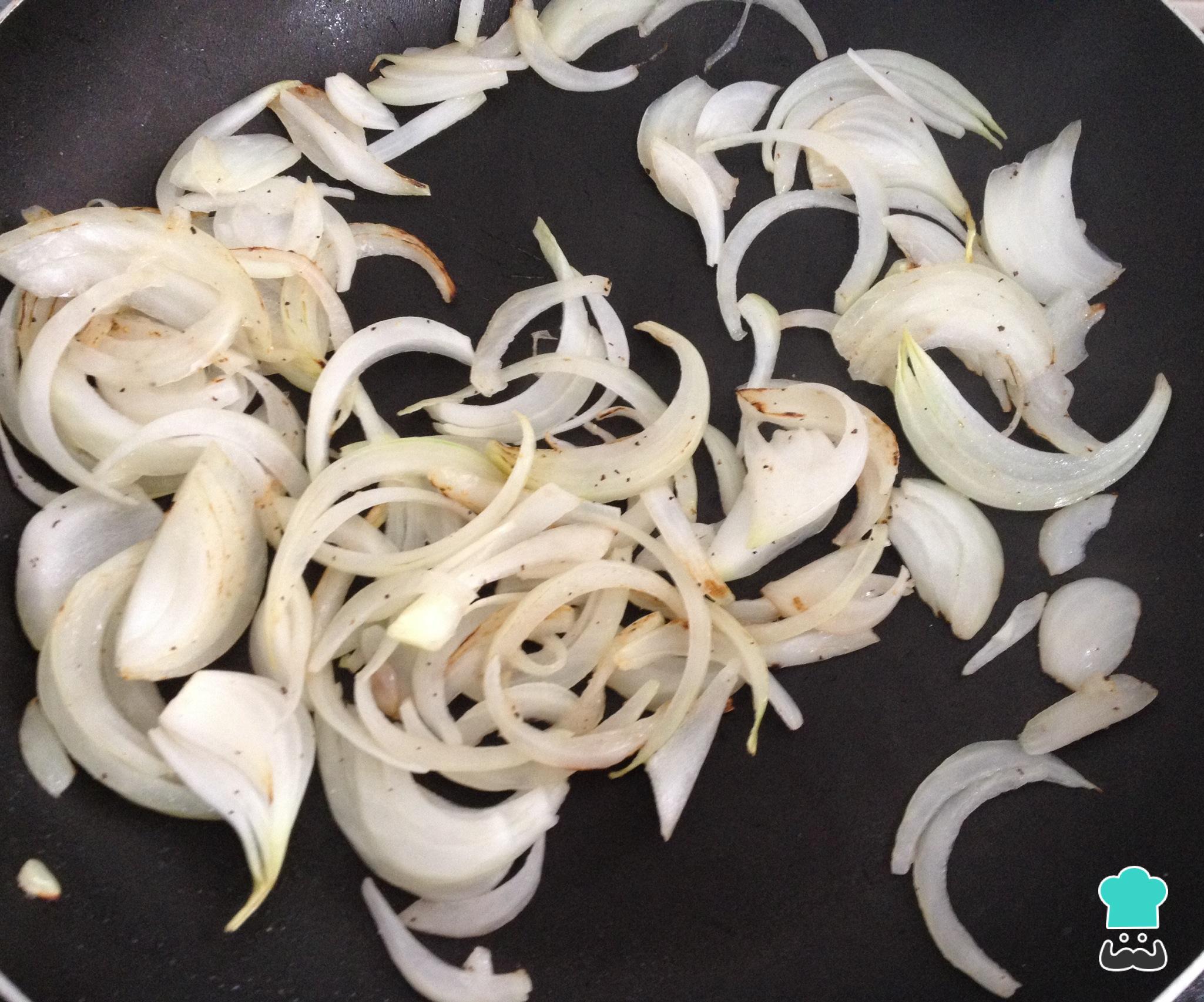 Corte a restante cebola em meias luas e leve a dourar na mesma frigideira em fogo alto com o azeite e sal. Desligue o fogo e reserve.