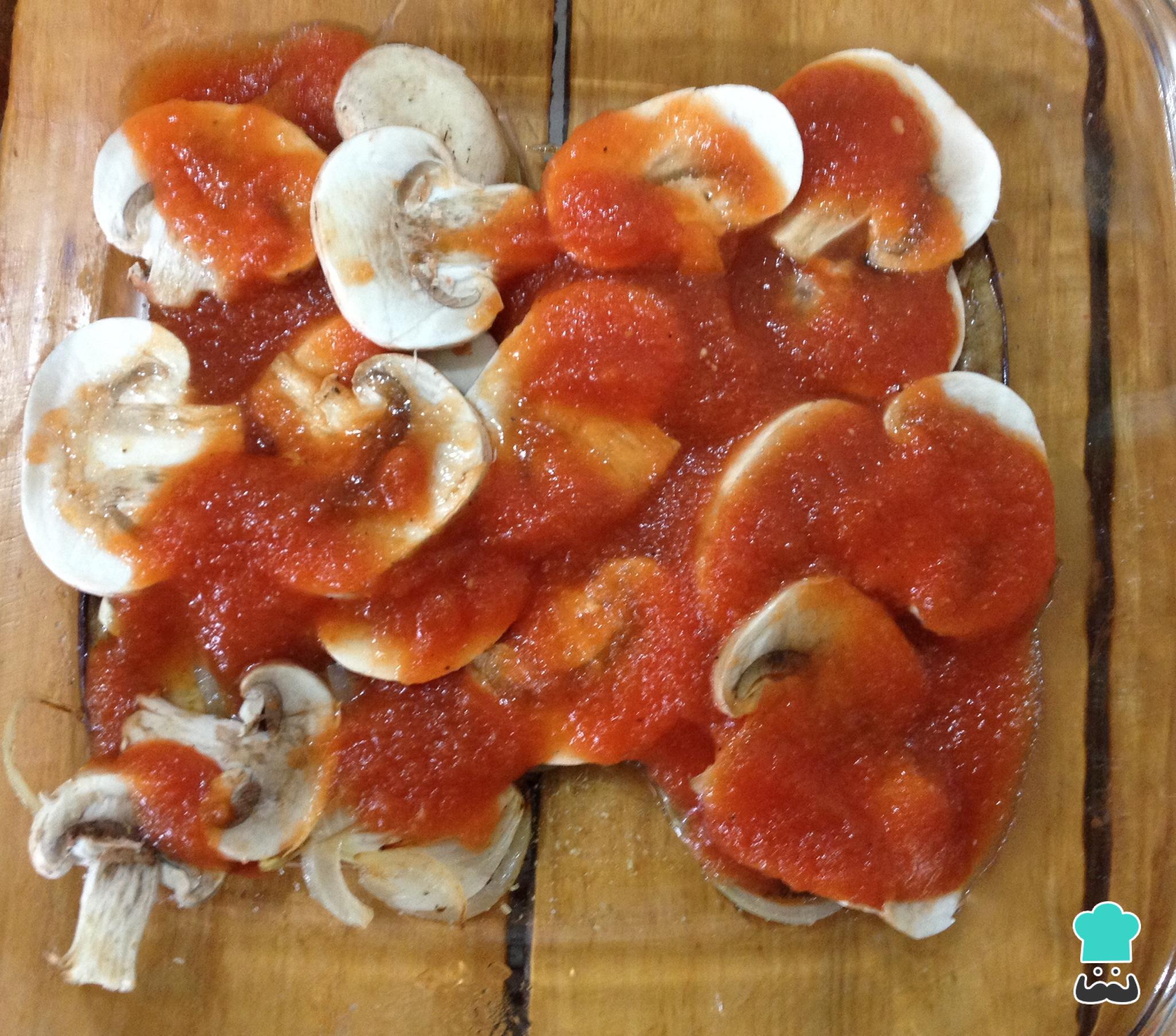 Para montar a lasanha disponha em um refratário um pouco de molho, alguma cebola, alguns cogumelos cortados em fatias e duas fatias de berinjela. Tempere com sal e pimenta e repita até esgotar os ingredientes.