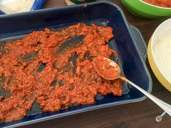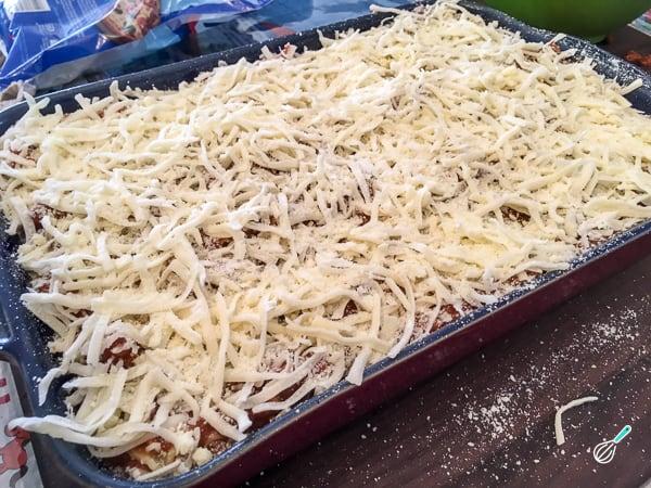 Finalize a lasanha com o restante molho de tomate, o restante creme de ricota e polvilhando a meia xícara de mussarela que sobrou. Leve ao forno preaquecido a 180ºC por 20 minutos.